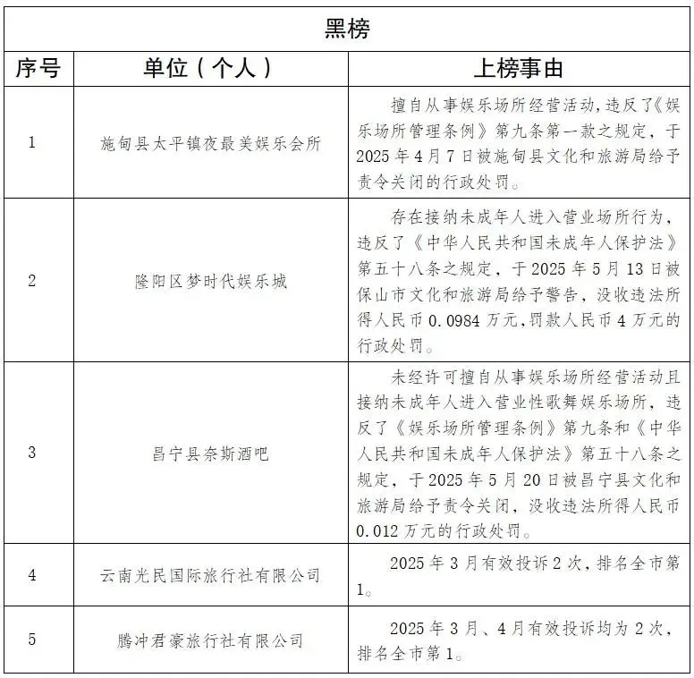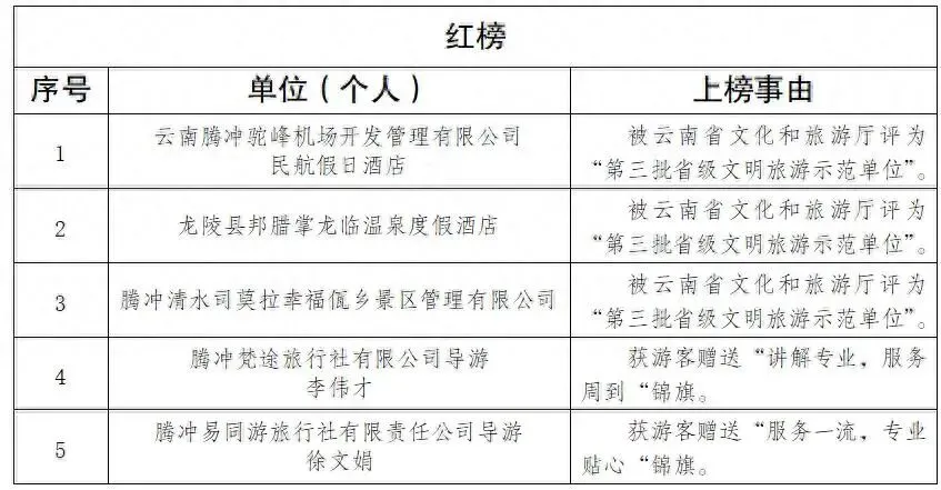 为认真贯彻落实《云南省人民政府关于印发云南省旅游市场秩序整治工作措施的通知》(云政发〔2017〕19号)精神,根据《保山市文化和旅游“红黑榜”制度》,决定将诚信守法的涉文、涉旅企业和有关从业人员纳入红榜,予以通报表扬;将违反文化、旅游相关法律法规,受到行政处罚的涉文、涉旅企业和有关从业人员纳入黑榜,予以通报警戒。现将名单通告如下,接受社会监督。