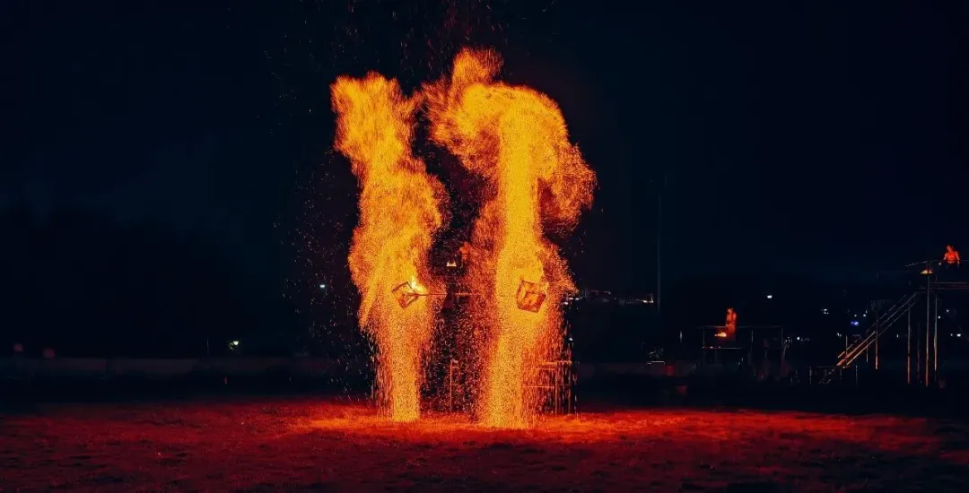 夜晚的灵龙谷景区热闹得让人目不暇接除了精彩纷呈的篝火晚会还有炫目的打铁花表演、惊险的喷火秀神秘的火壶展示以及动感十足的舞蹈和打歌舞等多种娱乐活动