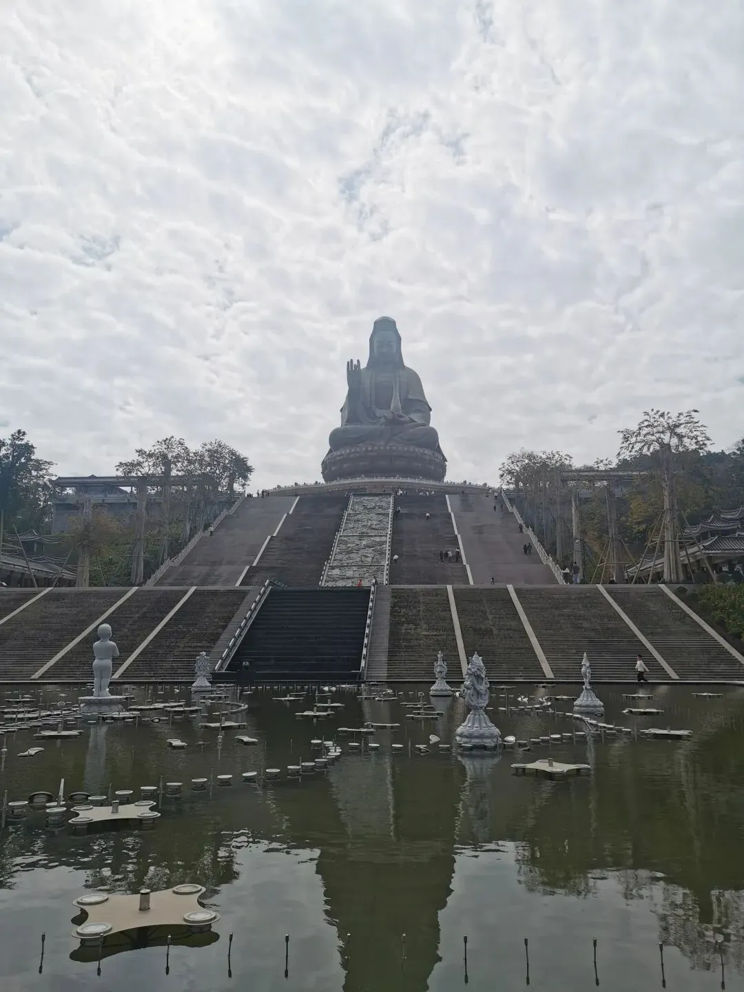 然后顺着台阶一路而上来到观音文化苑,穿过牌坊,展现在眼前的就是那283级开阔而整齐的青石台阶,台阶中间雕刻着九龙浮雕。一尊观音法像在山顶凌空玉立,白云披伏,气势恢弘,只见三面苍山,如龙蟠虎伏。法像通高61.9米,是目前世界上最高的铜造观音坐像。观音法像头戴宝珠冠,身披天衣着罗裙,弯眉朱唇,眼似双星,面部亲切慈祥,朝北俯望南海大地,祝愿人间安乐祥和。