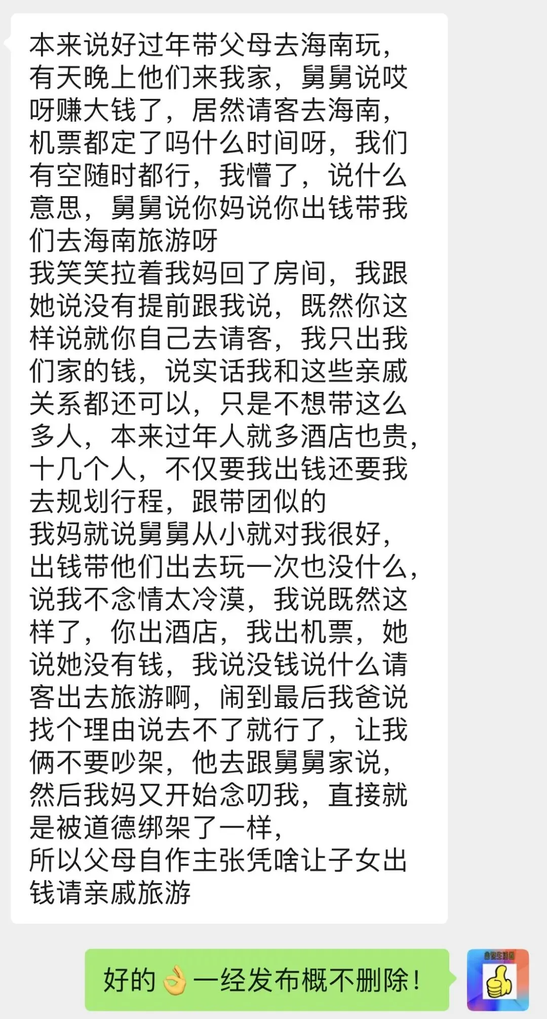 今天投稿的网友诉说父母擅自决定请舅舅一家旅游?来看看是发生了什么事 ···············