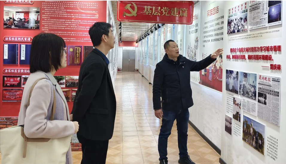 在何满红的陪同下,双方一同参观了社区红色研学基地并进行座谈交流。交流过程中,双方立足学院“旅游+外语”专业优势与法石社区的资源特色,重点探讨了世遗景点讲解词双语编译、景点宣传新媒体创作、学生社会实践、社区学校外语培训以及导游员、讲解员等从业人员培训等多项合作的可行性。何满红表示,希望能借助学院的专业力量,推动社区旅游从业人员队伍建设,提升社区内各级旅游资源的知名度,实现社区治理与文旅发展的双融双促。郑志明指出,学院始终坚持服务地方经济发展和产业转型,期待通过校地合作,助力社区文旅经济高质量发展,同时依托社区实践项目提升人才培养水平。