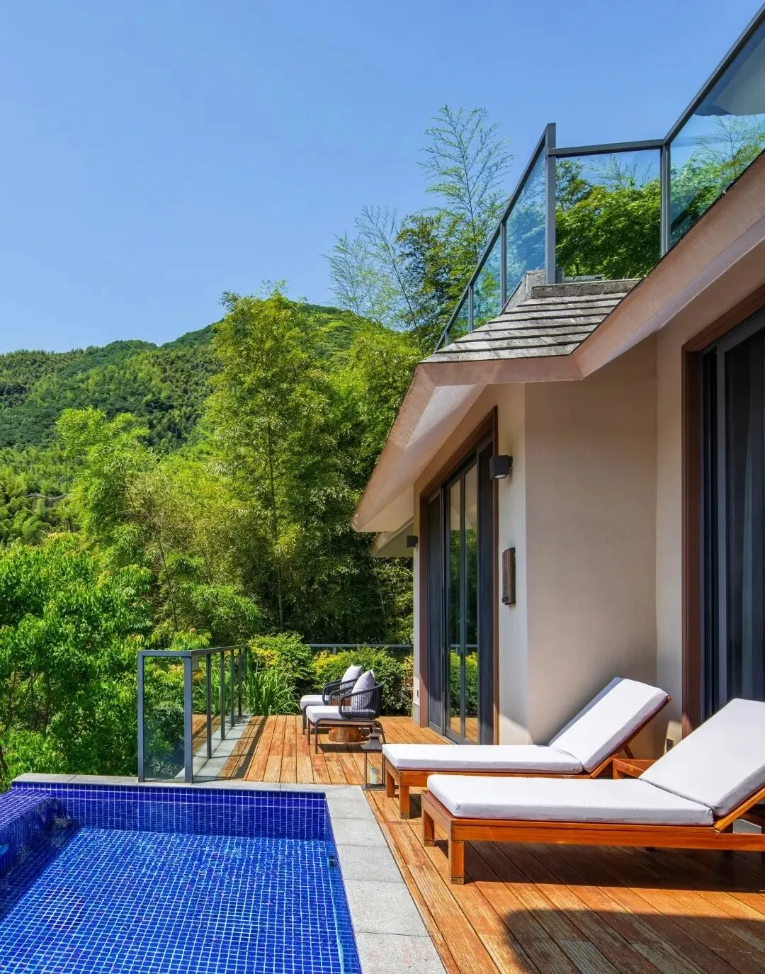 🌹核心亮点:这家被竹海和茶园包围,很有“小京都”的感觉。房间是新中式风格,阳台正对山景,顶楼还有私汤和天文望远镜,适合带娃家庭。早餐是自家种的食材,非常丰盛。