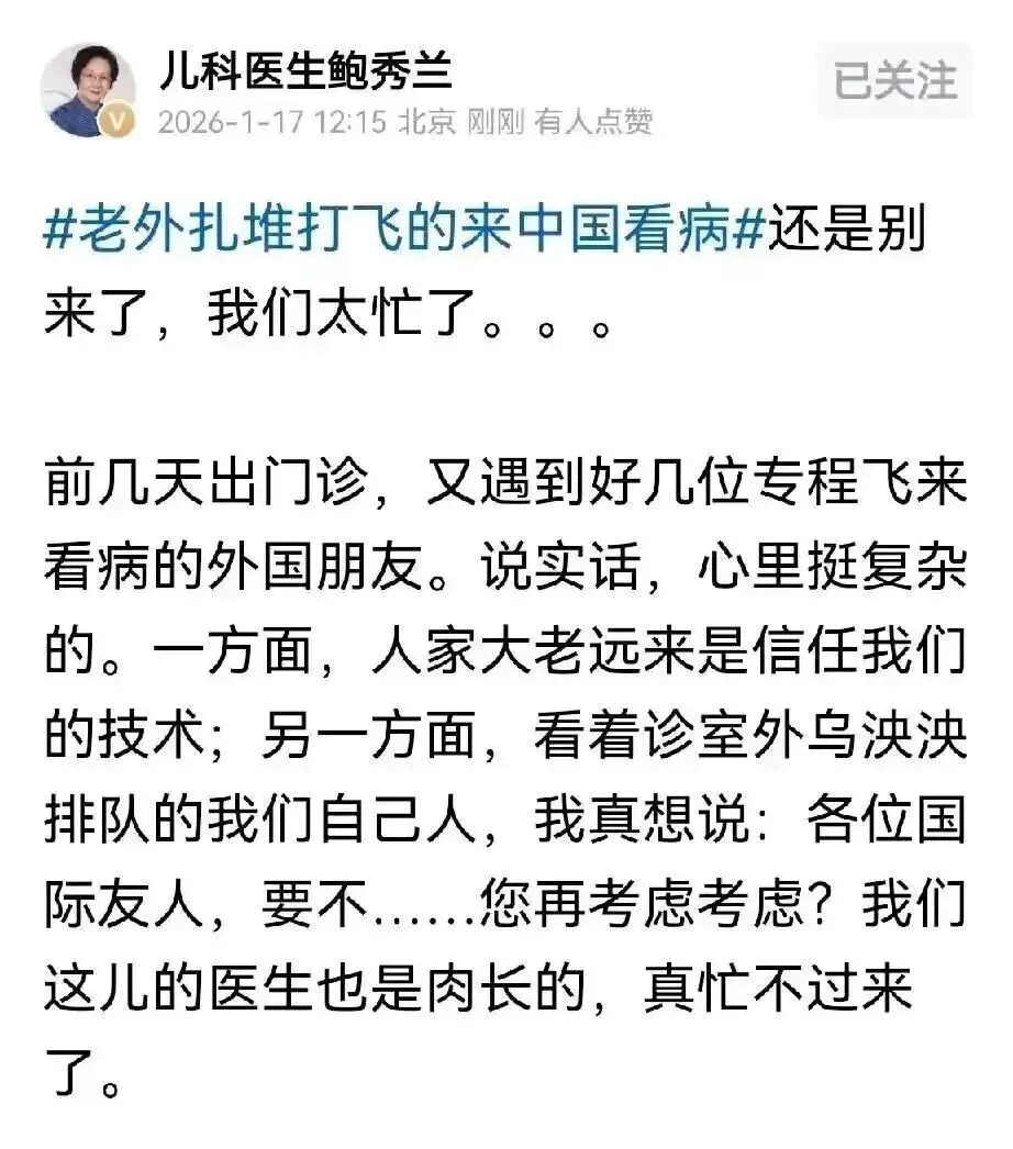 随着大批外国人来华就诊,有钱赚,部分医院自然很开心,但也有顶级医院的专家直呼压力大!1月17日,北京协和医院儿科专家鲍秀兰主任就表示:还是别来了,我们太忙了!