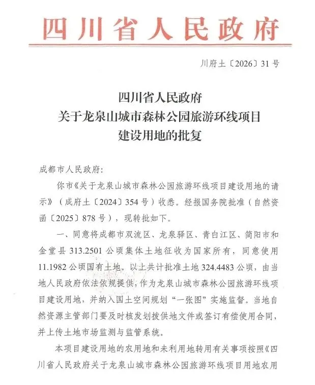 近日,四川省人民政府正式批复,同意征收双流区、龙泉驿区、青白江区、简阳市、金堂县共计324.45公顷土地,专项用于龙泉山城市森林公园旅游环线建设用地。这份批复为龙泉山城市森林公园旅游环线加快建设提供了关键政策与用地保障,既是项目落地的关键一步,更是串联五区市县、赋能生态文旅、利民富民的务实举措。