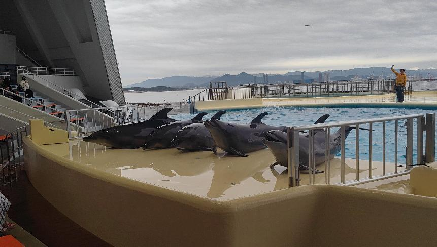 “福冈第一站是海中道海洋世界,导游说这里每天只有三场海豚演出,我们很幸运的赶上了半场,看表演的人挺多,但是没坐满,我和孩子坐在第二排近距离观赏(尽管可能被泼到水)。演出是半露天的,还能看到天上的飞机,海洋馆不大,跟国内的比起来,人不算多,但足够赏心悦目,可以安安静静的坐下仔细欣赏。”