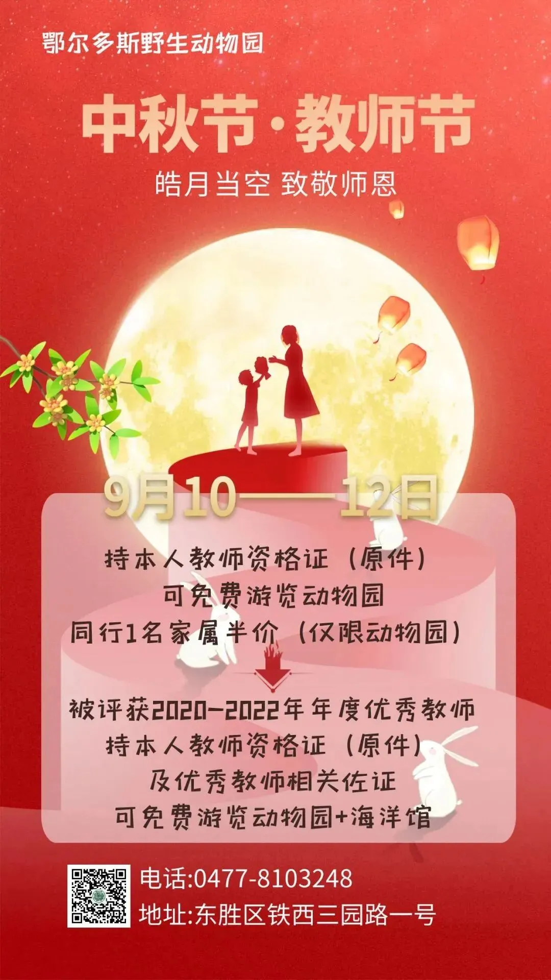 活动内容: 活动期间(9月10日-12日) 每日前91名持本人教师资格证的教师 即可在九城宫游客中心 免费领取九城宫“印象伊克汗娱乐套票”1张 活动时间:2022年09月10日-12日 领取地点:九城宫游客中心 备注:每人限领取1张 双节至,送惊喜 小长假期间 九城宫草原卡丁车现场买票 买5车送1车 活动时间:2022年09月10日—12日 活动地点:九城宫草原漫瀚文化旅游区 注:仅限草原卡丁车项目处现场购买车票