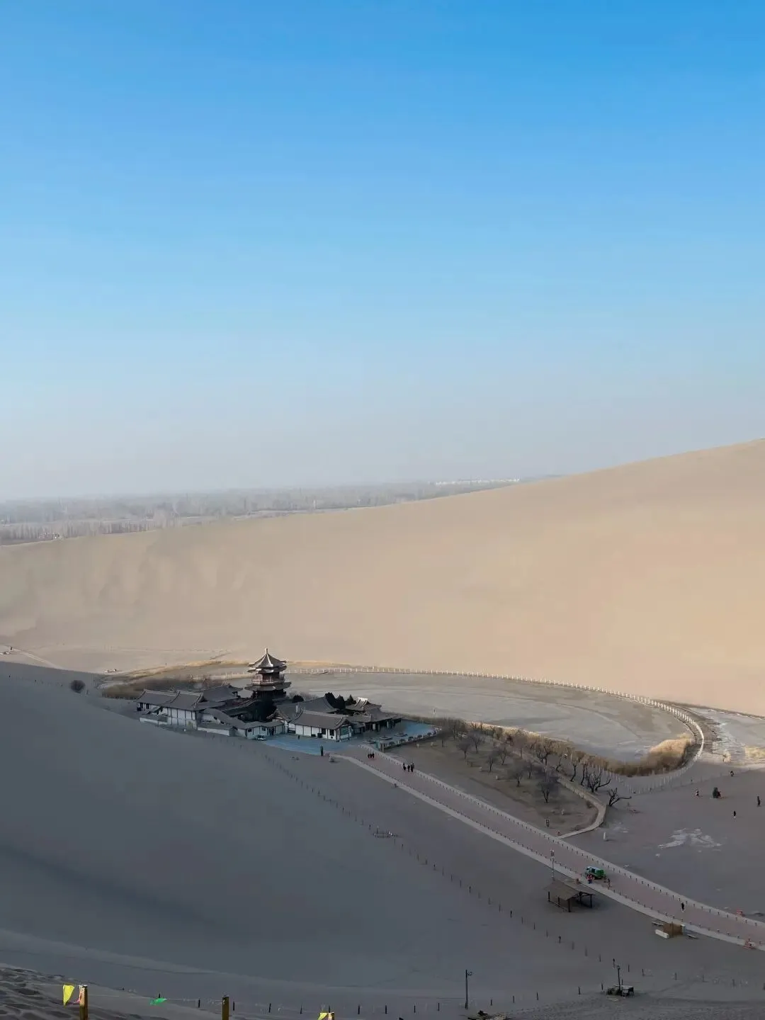 天还没亮。我们打车去了鸣沙山月牙泉。到的时候景区还没正式开门,但已经有一堆游客在等了。买了票进去,景区工作人员指了个方向说"往那边走,日出在东边"。