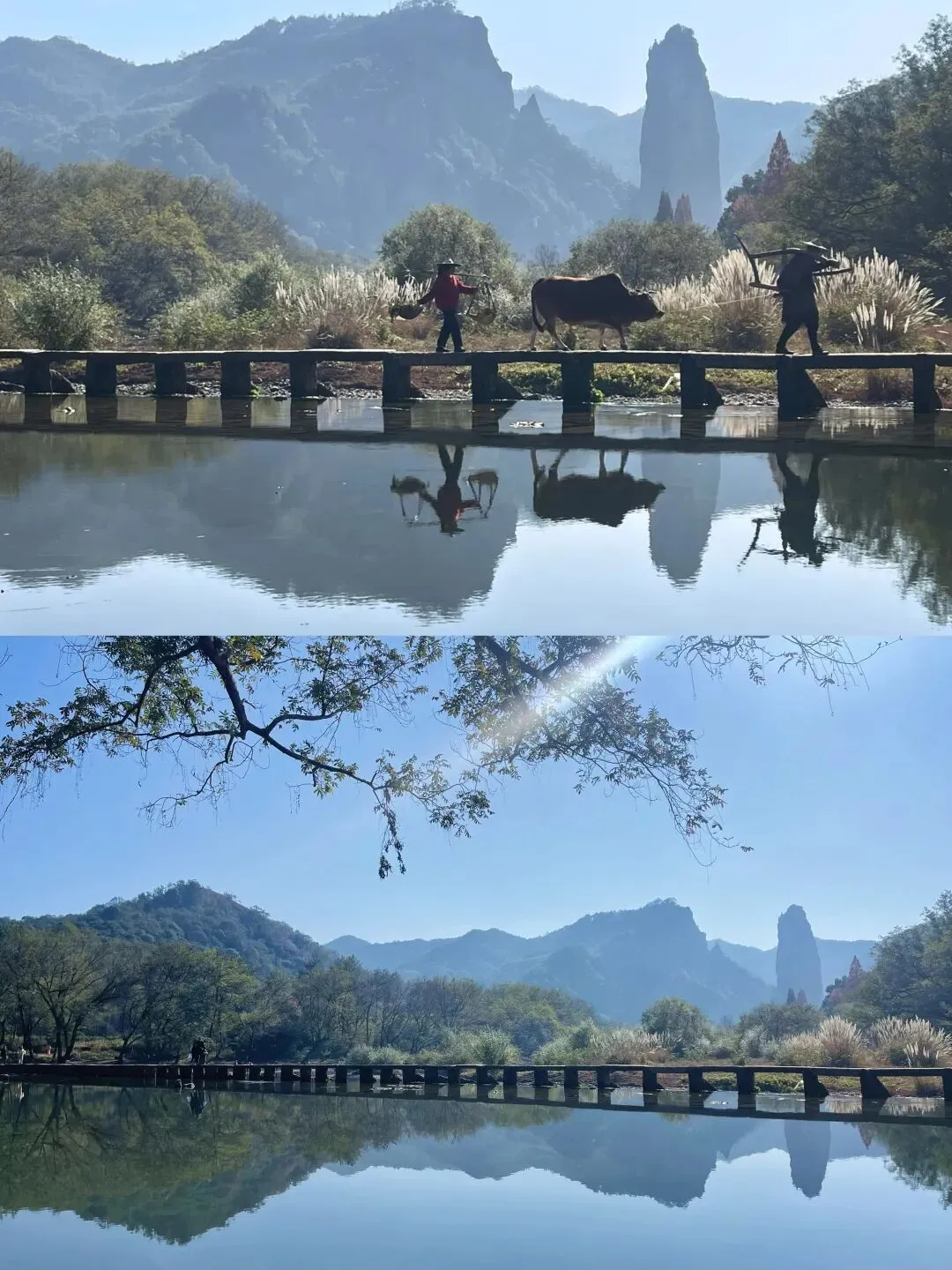 在鼎湖峰的山顶其实能看到远处的朱潭山老农牧牛的地方。所以缆车下来后,是从鼎湖峰走到朱潭山的,路程大约在1公里左右,天气好的话,还是比较适宜的。朱潭山的火出圈的就是老农牧牛了,但这个场景是真的要看节目单根据表演时间来的。每天大概有4-6场可以观看,每场就10分钟左右,还是特别网红,人很多的一个出片点。