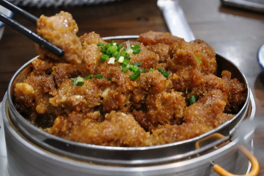 粉蒸肉的灵魂在于米粉,一般会选用特定的早稻米,在锅中炒至喷香金黄,再粗磨成粉。这样手工制作的米粉颗粒感更足,在蒸制过程中能更好地吸收食材的油脂和精华,咸香可口。