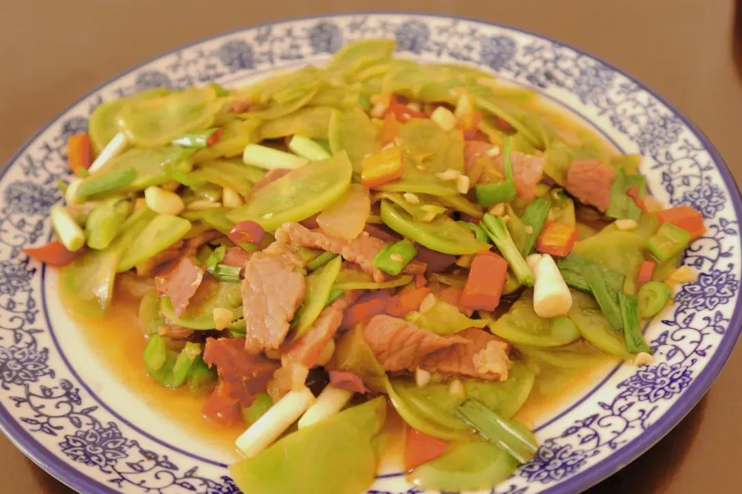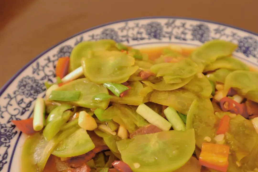 青番茄口感爽脆,带着清新的酸爽,中和掉了腊肉的油脂感。
