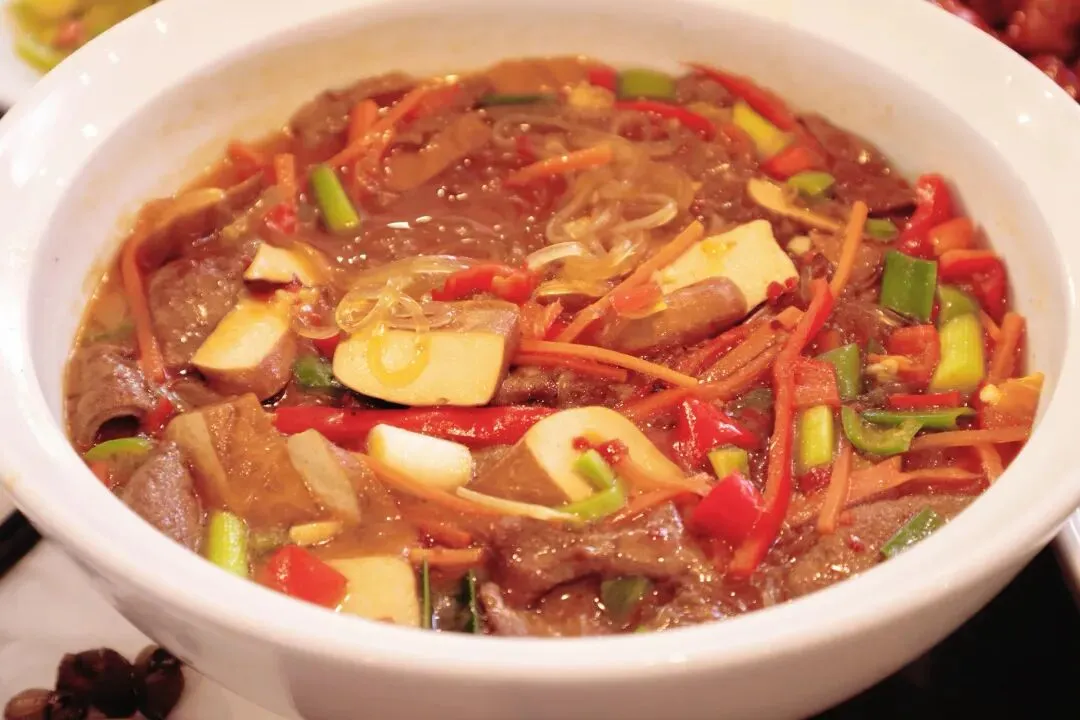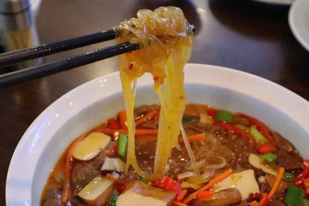 桐村三层楼这道菜,底层垫着咸鲜脆韧的萝卜干,中间铺上爽滑劲道的番薯粉丝,顶层则盖上嫩滑的猪肝。层次分明,拌饭超级香。