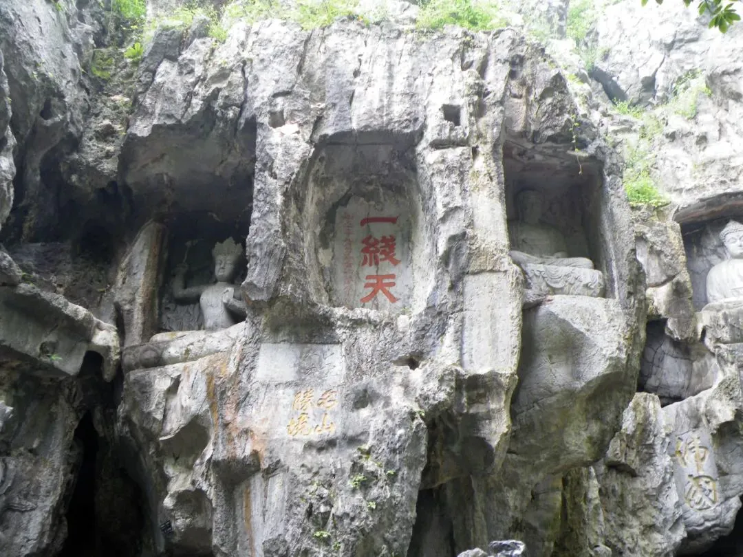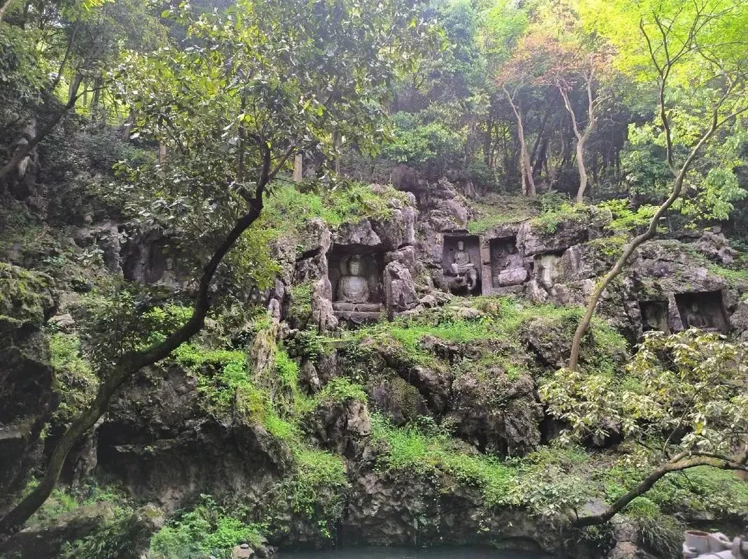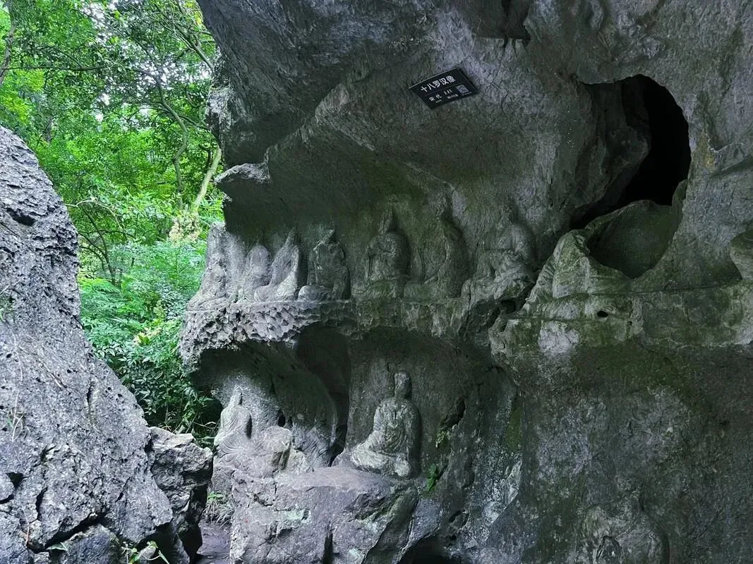 龙泓洞(观音洞):洞口宋代“白马驮经”故事,刻画高僧摄摩腾、竺法兰西行取经场景。洞中端坐元代观世音造像,左侧射旭洞可见“一线天”。