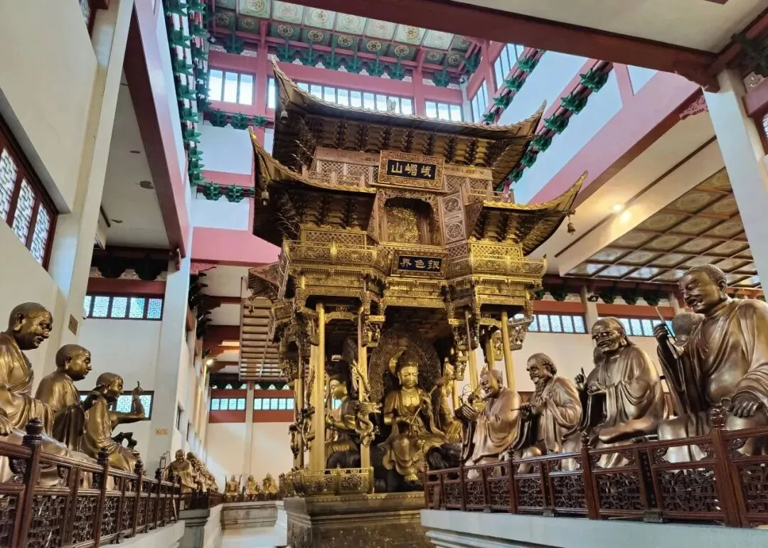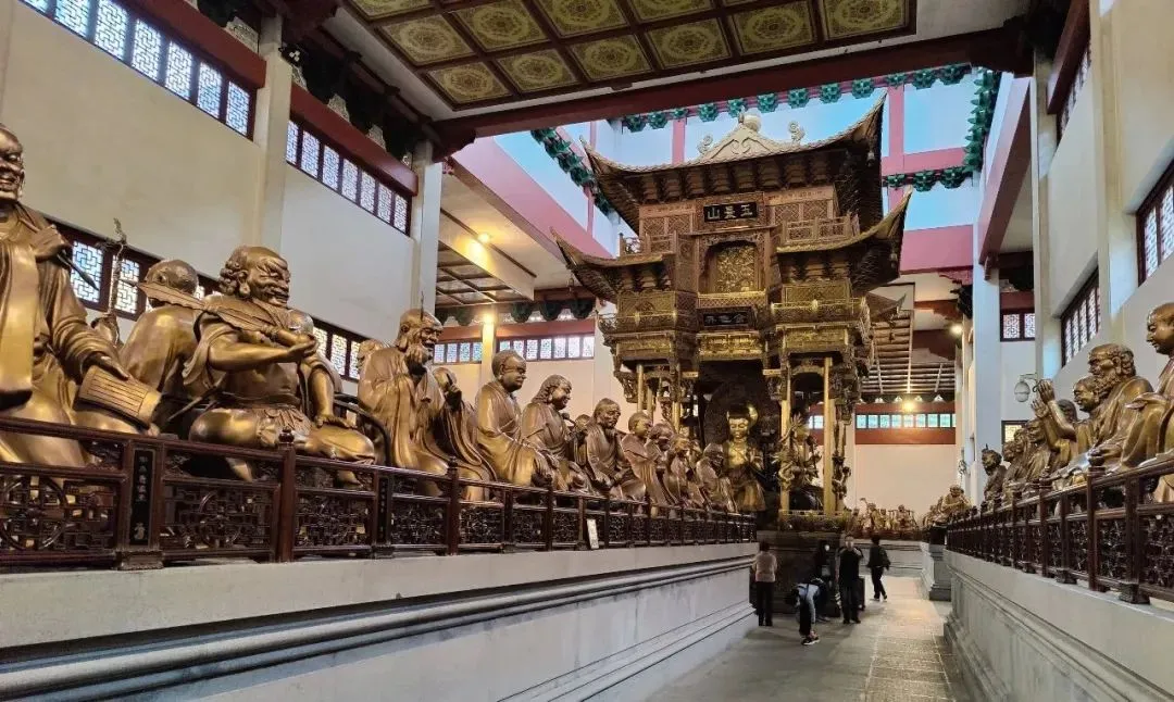 “卍”字形平面设计:殿堂平面呈佛教吉祥符号“卍”字形,象征“万法唯心、万德圆融”,为国内唯一采用此布局的罗汉堂。中央矗立12.62米高的四大名山铜殿,以青铜打造,三重飞檐歇山顶,获吉尼斯“世界最高室内铜殿”纪录。铜殿由工艺大师朱炳仁设计,耗时400天,四面浮雕呈现五台山、普陀山、峨眉山、九华山胜景。