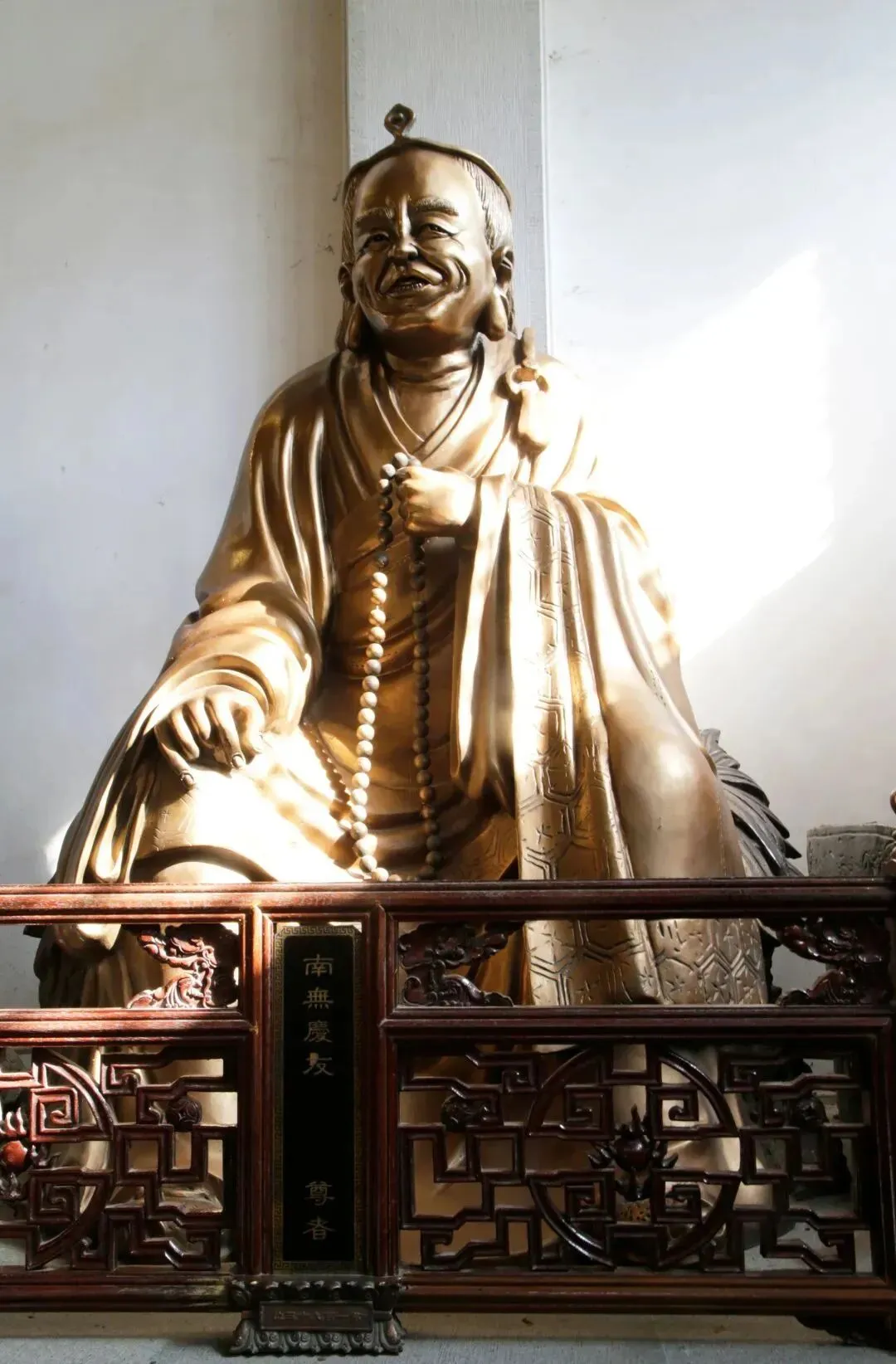 济公像:在偏殿,右手执破扇、左脚踏酒缸,还原“酒肉穿肠过”的狂禅形象