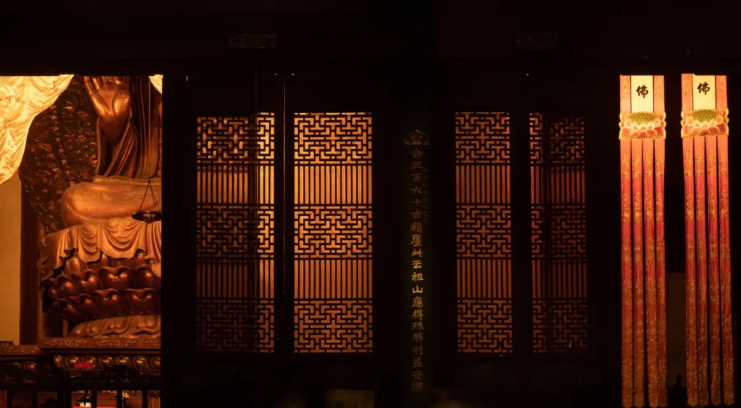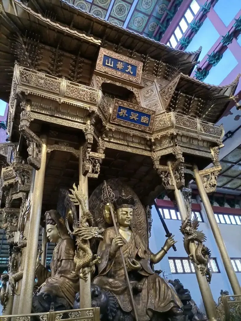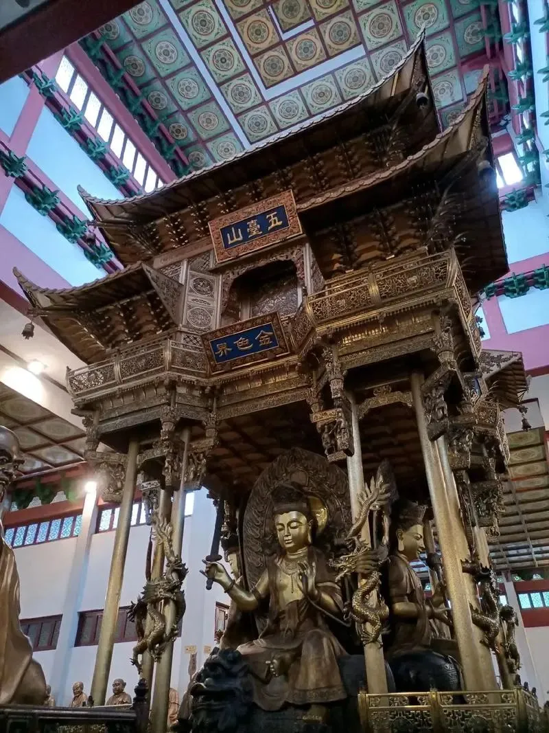 代表学业事业:在民间信仰中,华严殿被视为“保佑读书与智慧”之地,学子常至此祈愿学业精进。殿内主供“华严三圣”,为整根珍贵楠木雕刻的巨型造像(总高13米),工艺精湛,金箔缀饰,为现代佛教艺术杰作。