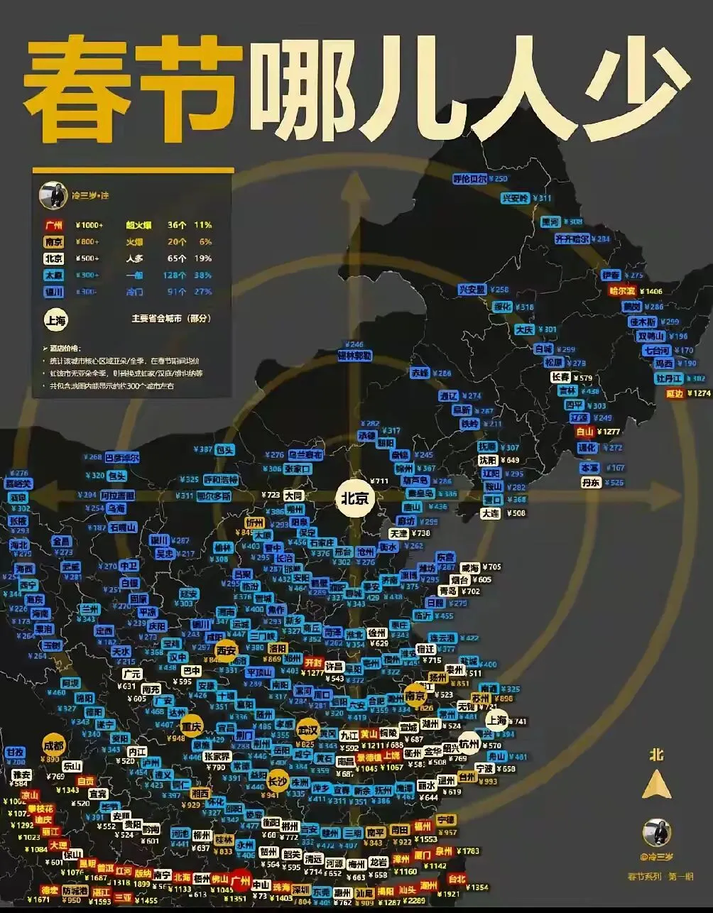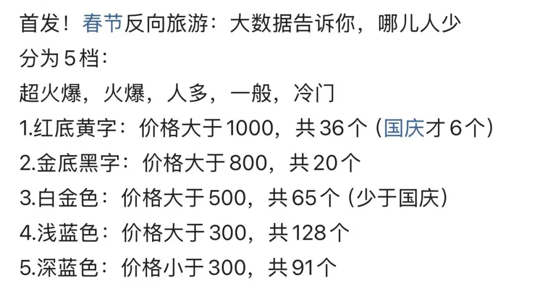 想起前两天在网上看的一张图片,“春节哪儿人少?”大数据说分为5档,超火爆、火爆、人多、一般、冷门。