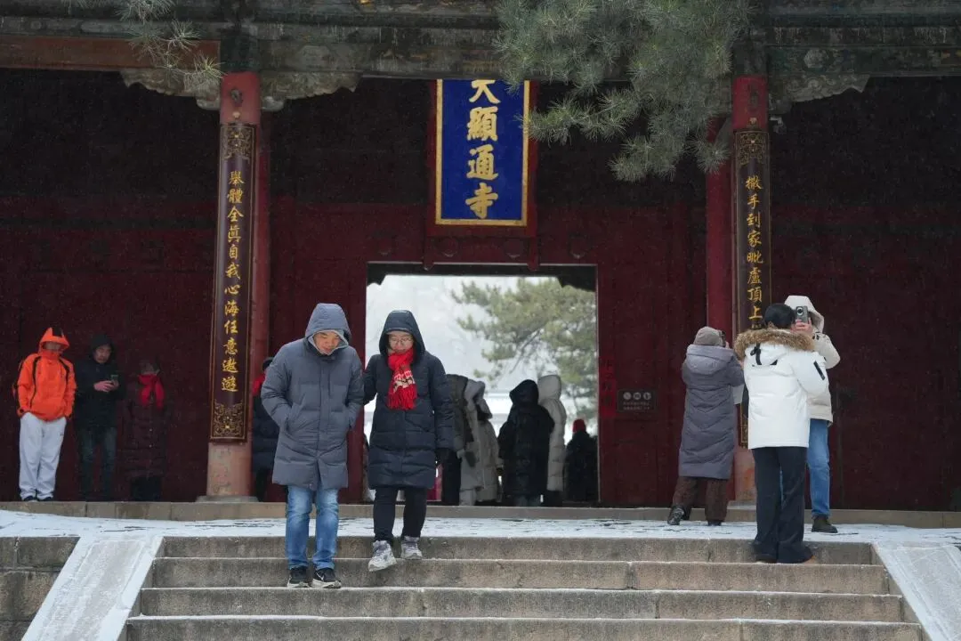五台山景区迎来2026年立春后首场瑞雪 环卫工人清雪保安全