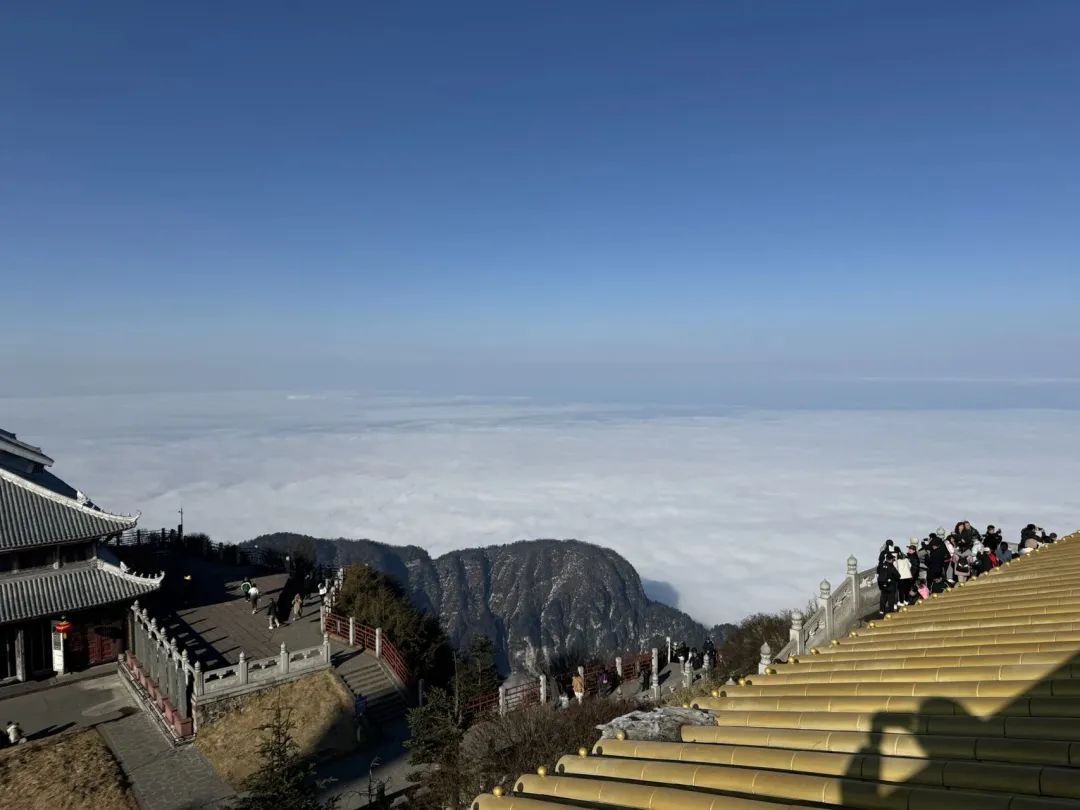 导游说今年峨眉山远比往年爆火,以往游客得从大年初三开始增多,今年初一就已经满员了。截至昨天下午一点四十五,今天的索道票就已售罄。还没有下山,今天前往峨眉山的大巴车票也已售罄。