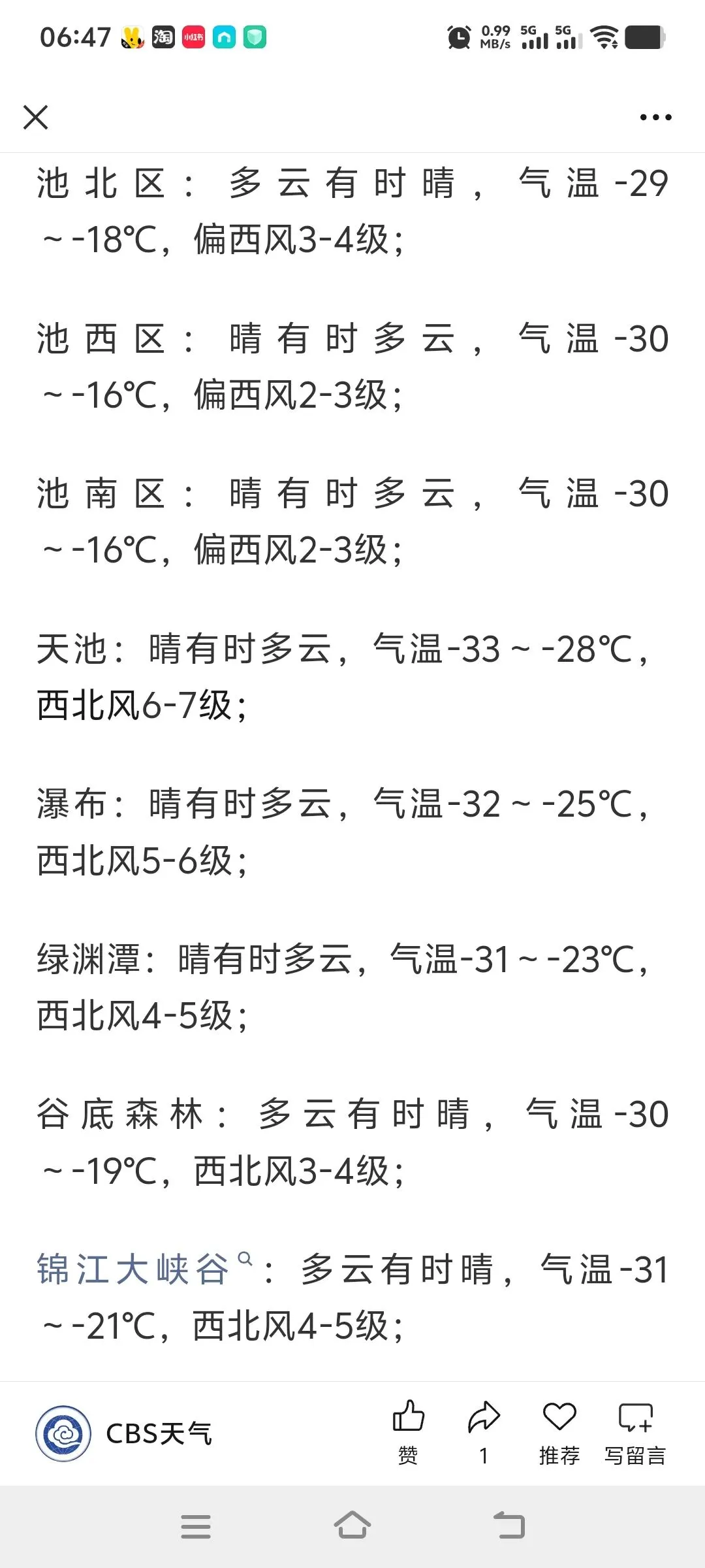 ➡️北景区天池主峰,风力较大,公路、栈道积雪结冰,不具备安全运营条件,天池景点全天关闭。其他景点正常开放,视天气情况随时关闭。 ➡️西景区主峰,风力较大,公路积雪结冰,不具备安全运营条件,天池景点全天关闭。粉雪谷、锦江大峡谷景点,正常开放,视天气情况随时关闭。 ➡️南景区关闭。