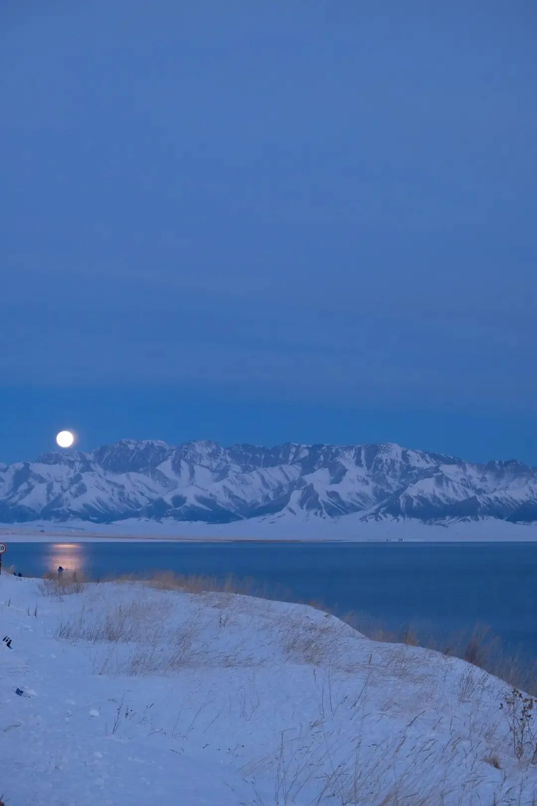 下午4点进赛里木湖蹲日落,当天云层有点厚,但丝毫不影响它的美。第二天早上9点二进赛湖,本来冲着日出和环湖去的,结果意外邂逅了海上升明月的蓝调奇景!湖水蓝得像宝石,月光洒在湖面波光粼粼,肉眼看到的美,任何设备都拍不出来,真的不枉此行!