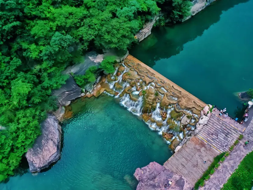 更绝的是宝泉的水,这是南太行最灵动的意外之喜。别处的太行以雄奇见长,而宝泉的潭水绿得发亮,像被群山捧在手心的翡翠,水流顺着峡谷蜿蜒,时而平缓成镜,映着峭壁苍松;时而跌落成瀑,水雾中隐约可见彩虹。