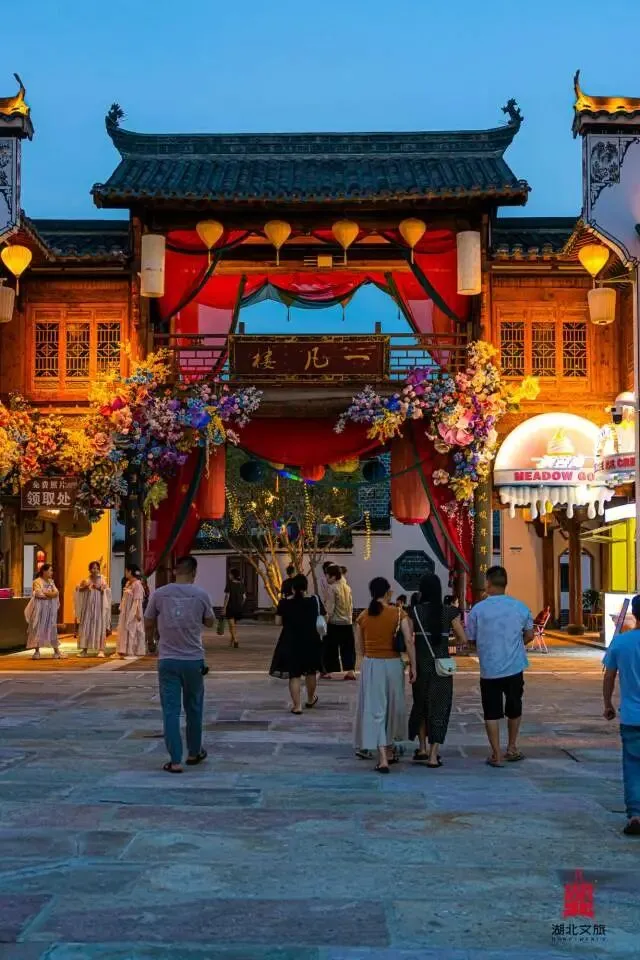 祥云湾的257栋迁建古建,是游客们最爱的打卡地。徽派的马头墙、京派的四合院、江南的水榭楼台,一步一景,游客们换上汉服,在古巷中穿行,拍出来的照片宛若穿越千年。白天,楚剧演员在戏台开嗓,皮影艺人在茶馆演绎《秦简故事》,三节龙队沿着古街巡游,鼓点震天,游客们跟着队伍前行,伸手触摸龙身,感受非遗的活力;夜晚,古建灯光亮起,楚乐电音派对开场,花船游湖时,游客们坐在船上,看两岸灯火璀璨,吃着云梦小吃,晚风拂过,满是惬意。不少游客选择住在这里的古建民宿,推开窗便是古色古香的院落,清晨被鸟鸣唤醒,体验“枕着古建入眠,伴着楚风醒来”的慢生活。