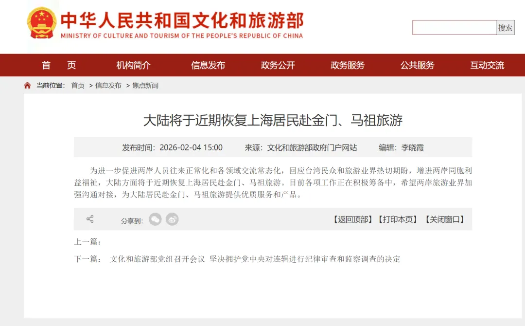 导语:两岸旅游交流迎来重要利好消息! 继福建居民赴金马旅游恢复后,大陆方面近日正式宣布,将于近期恢复上海居民赴金门、马祖旅游。这标志着两岸人员往来正常化进程又迈出了实质性的一步。