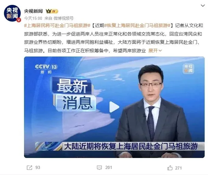 大陆将于近期恢复上海居民赴金门、马祖旅游!