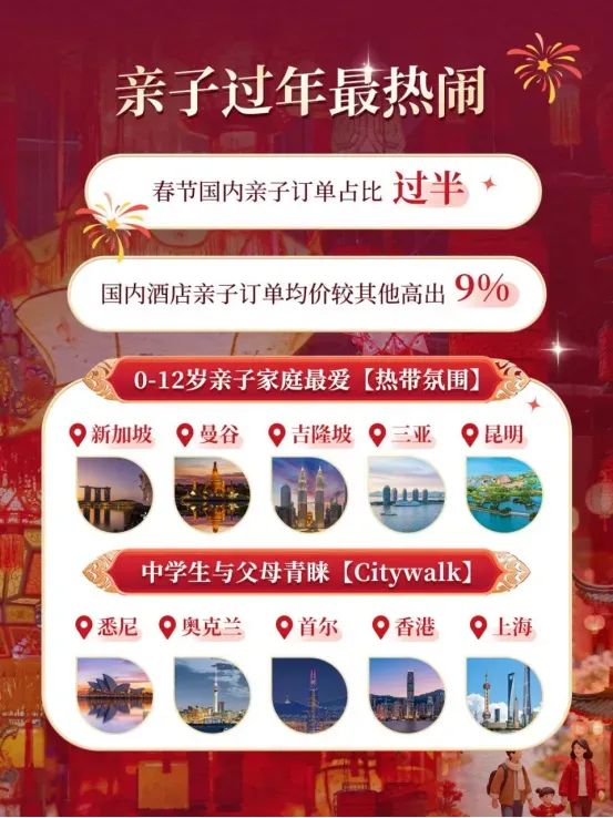 在家庭出行结构上,春节出游呈现出“向内团圆”与“向外探索”并存的特点。 一边是经典的合家欢。途牛报告显示,选择三代同游的用户占比高达34%,亲子游需求随之激增,这让北京、上海、三亚等设施完善的目的地持续火爆。