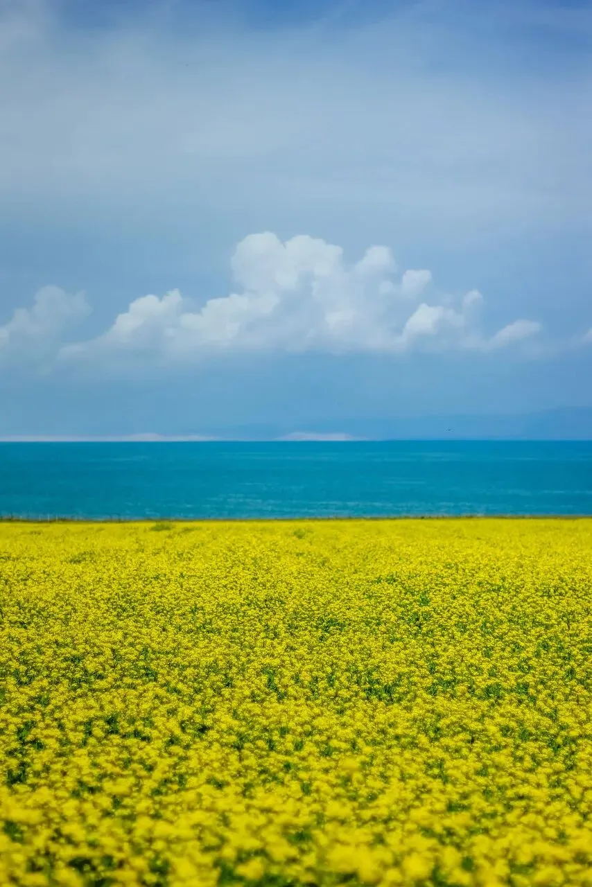 找一片油菜花地,跳进去、跑进去,沿着小道两旁无尽的金黄、向着湖面的蓝冲去。