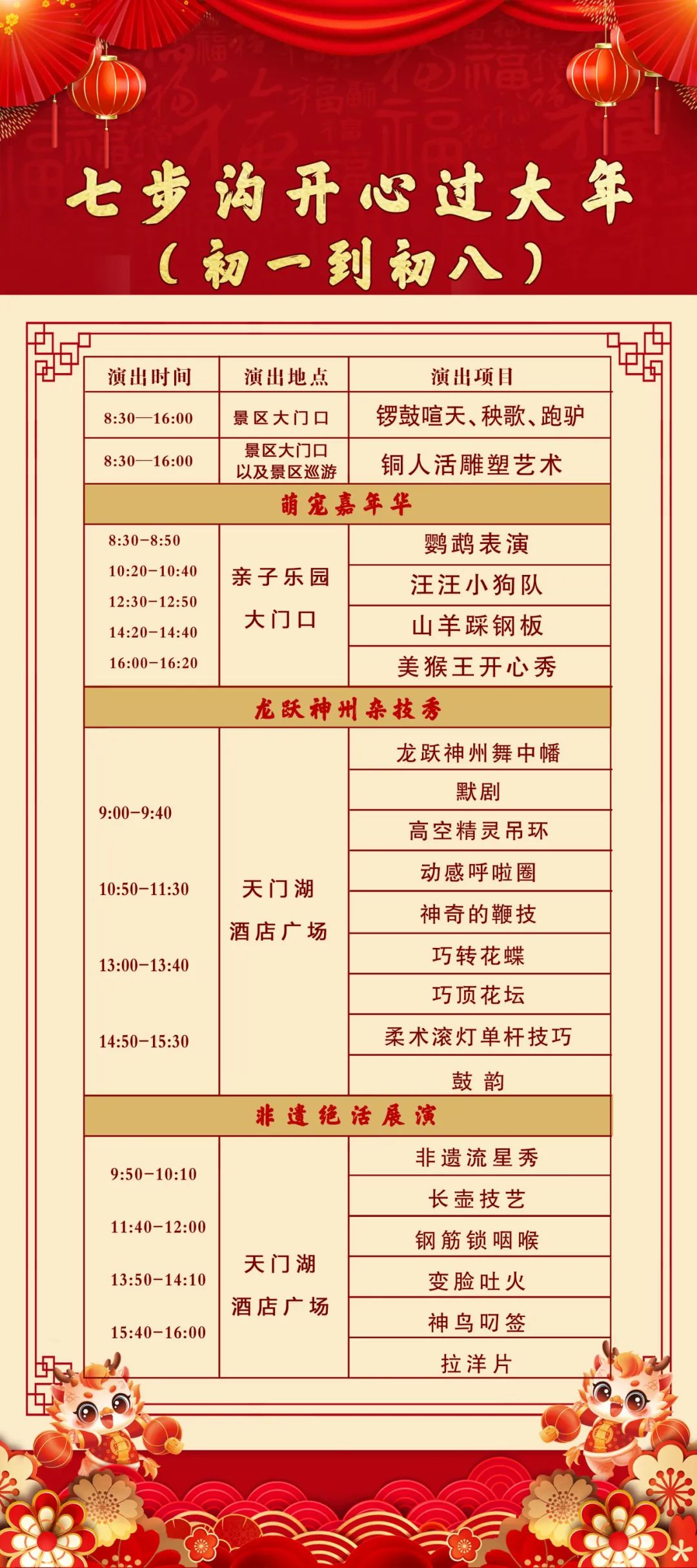 春晚节目龙跃神州、云上逐梦等原班人马入驻七步沟,川剧变脸喷火、钢筋锁喉、动物杂技表演、网红铜人等绝活表演让您看不停。