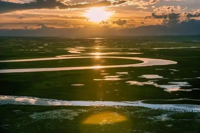每当日落西山之时 万道霞光铺洒在草原上的河流
