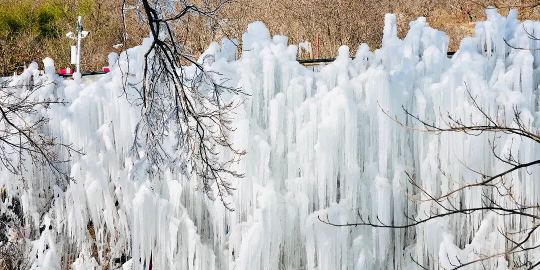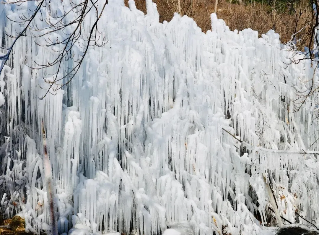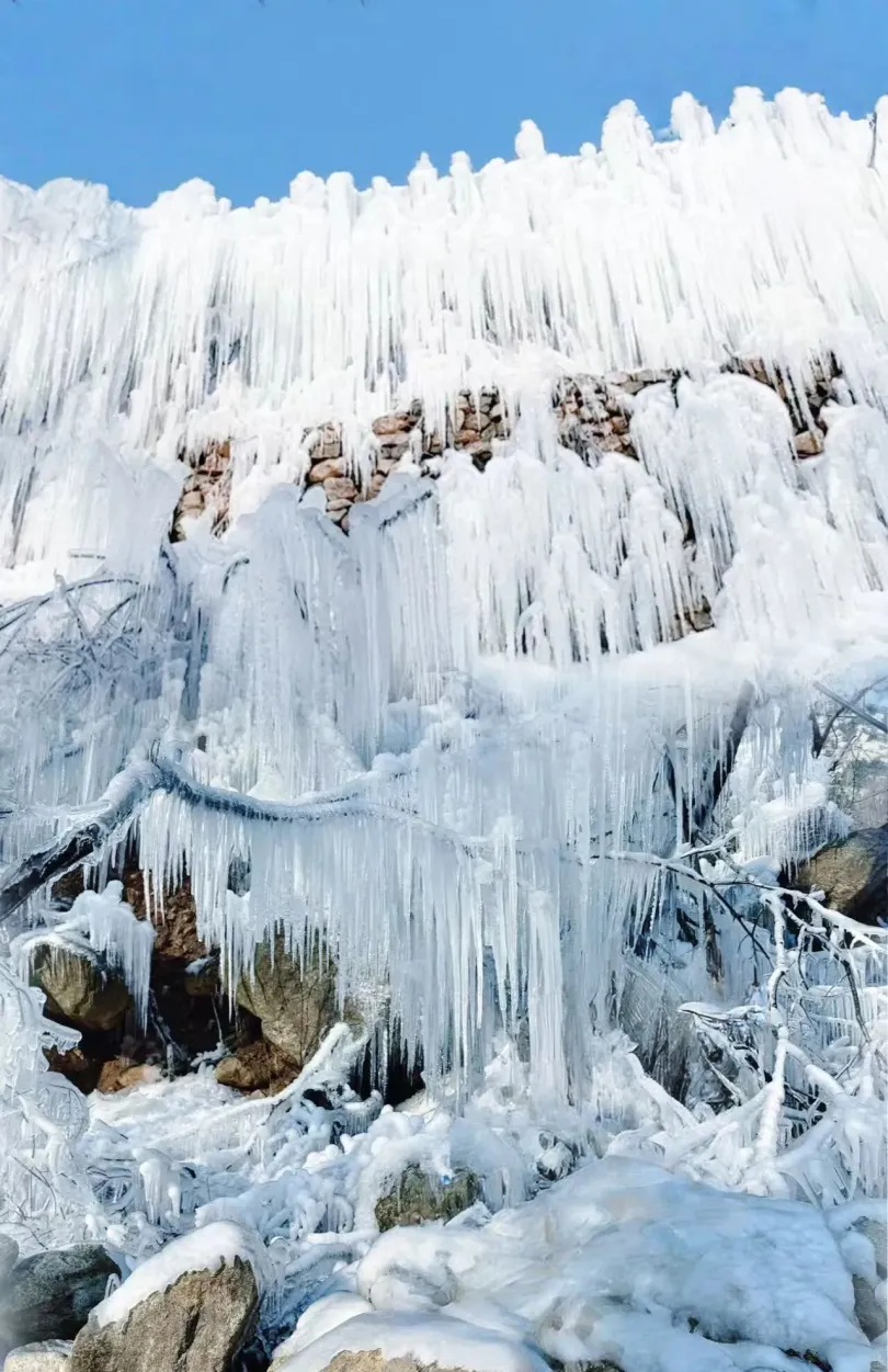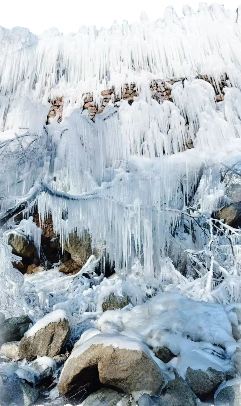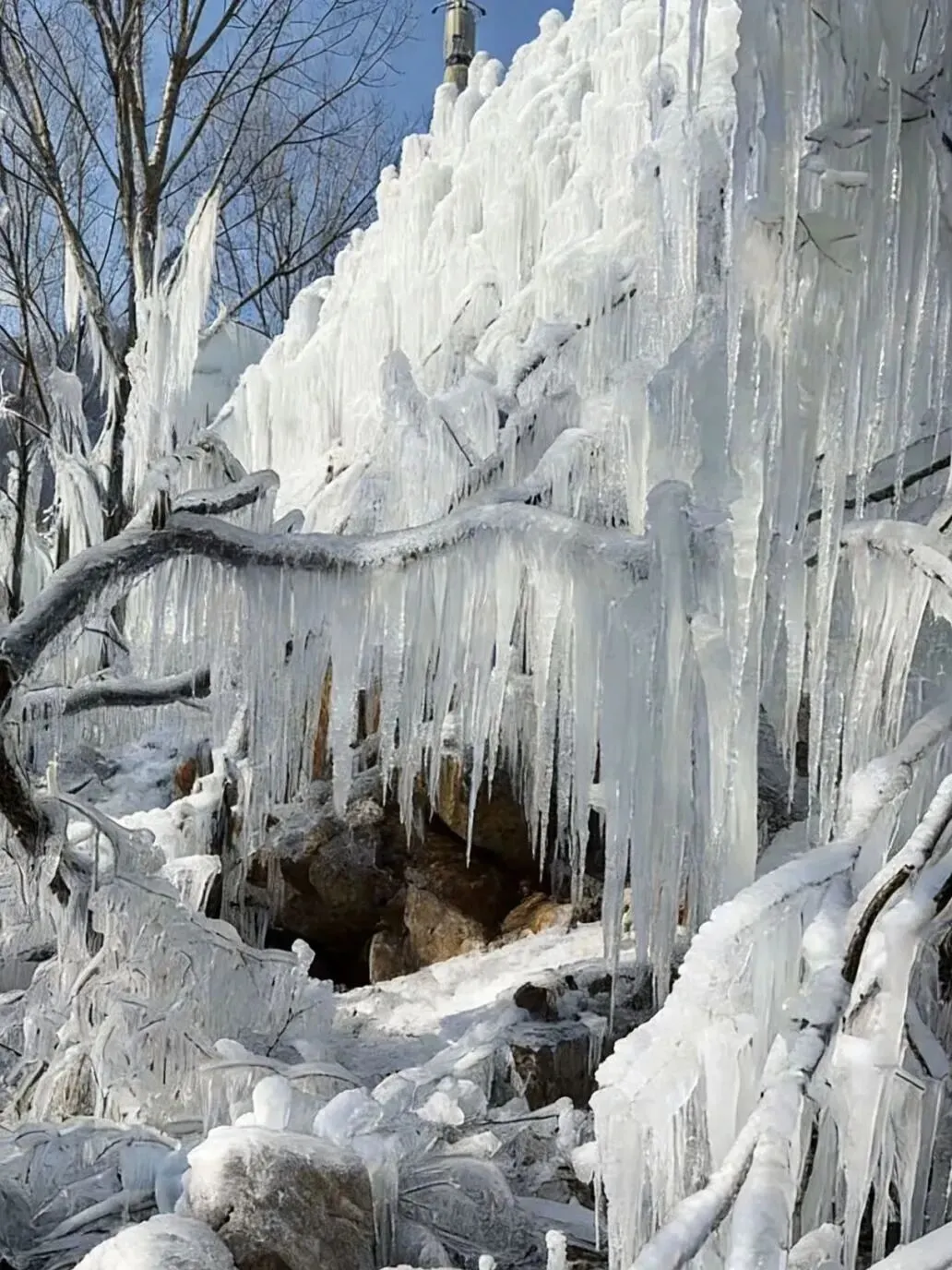 天蒙梦幻冰瀑是依托景区自然资源,在冬季低温环境下打造的冰雪景观,百丈冰挂如玉石帘般垂落,阳光折射下泛着淡蓝光晕,随手一拍都是壁纸级画面,堪称冬日限定的自然艺术品。冰瀑群规模宏大,冰柱、冰挂、冰帘等错落交织,形态各异,宛如天然形成的“冰雪宫殿”。阳光穿透冰层,折射出晶莹剔透的光影效果,冰瀑呈现出纯净的淡蓝色,随手一拍即可获得高品质打卡照片。