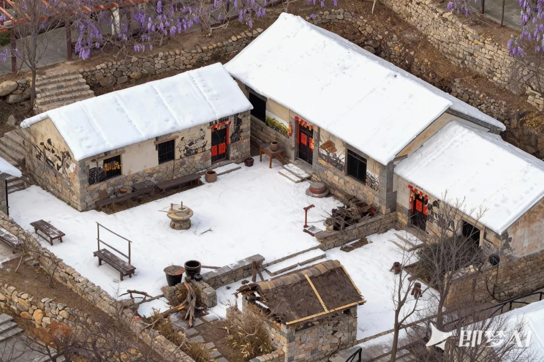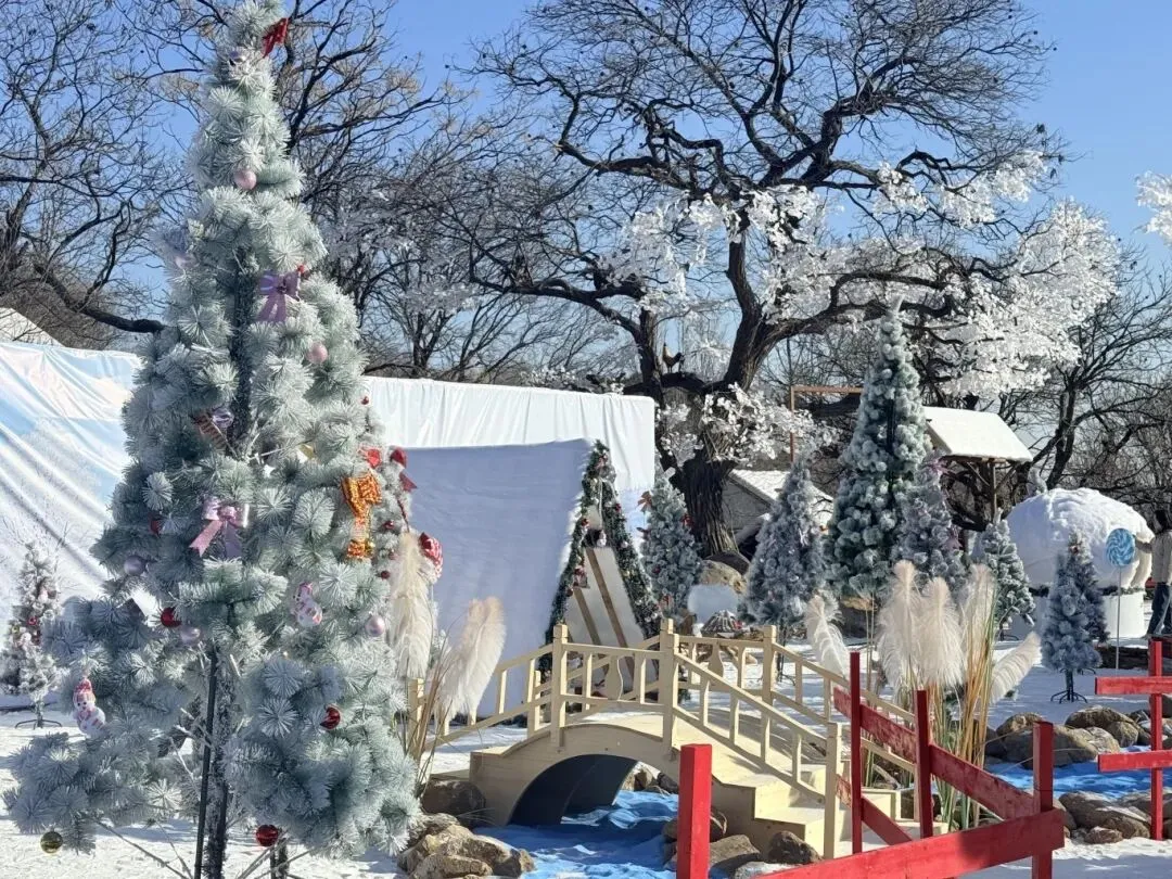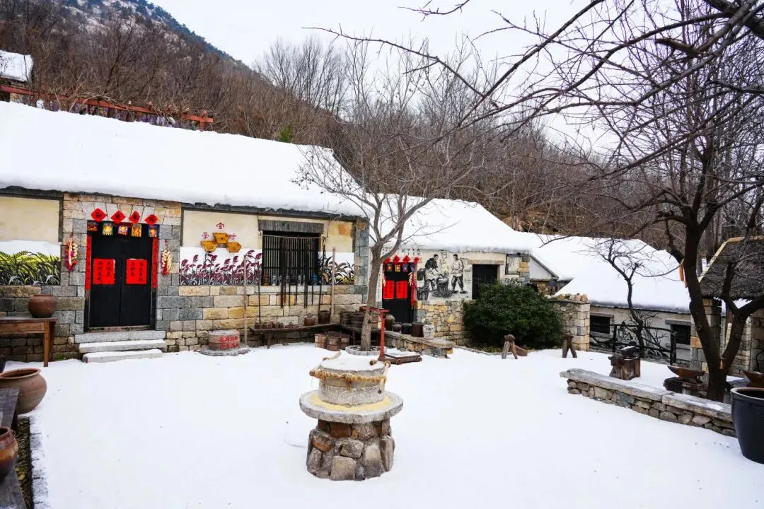 景区通过人工造雪铺设积雪景观,搭配红灯笼长廊、特色雪屋等装饰元素,设置创意打卡装置方便游客合影。穿过挂满金黄玉米串和火红辣椒的小桥,仿佛踏入传统沂蒙山村冬日画卷。踏入沂蒙山小调民俗村,可见热闹的年画市集,陈列传统年画与手工艺品。村中处处是景,糖葫芦打卡点、沂蒙方言墙、覆雪石墙老屋等景观,尽显沂蒙村落质朴年味。为深化民俗体验,雪乡安排非遗展演活动,涵盖沂蒙秧歌、传统舞狮、皮影戏等本土特色项目,让游客沉浸式感受沂蒙民俗文化魅力。