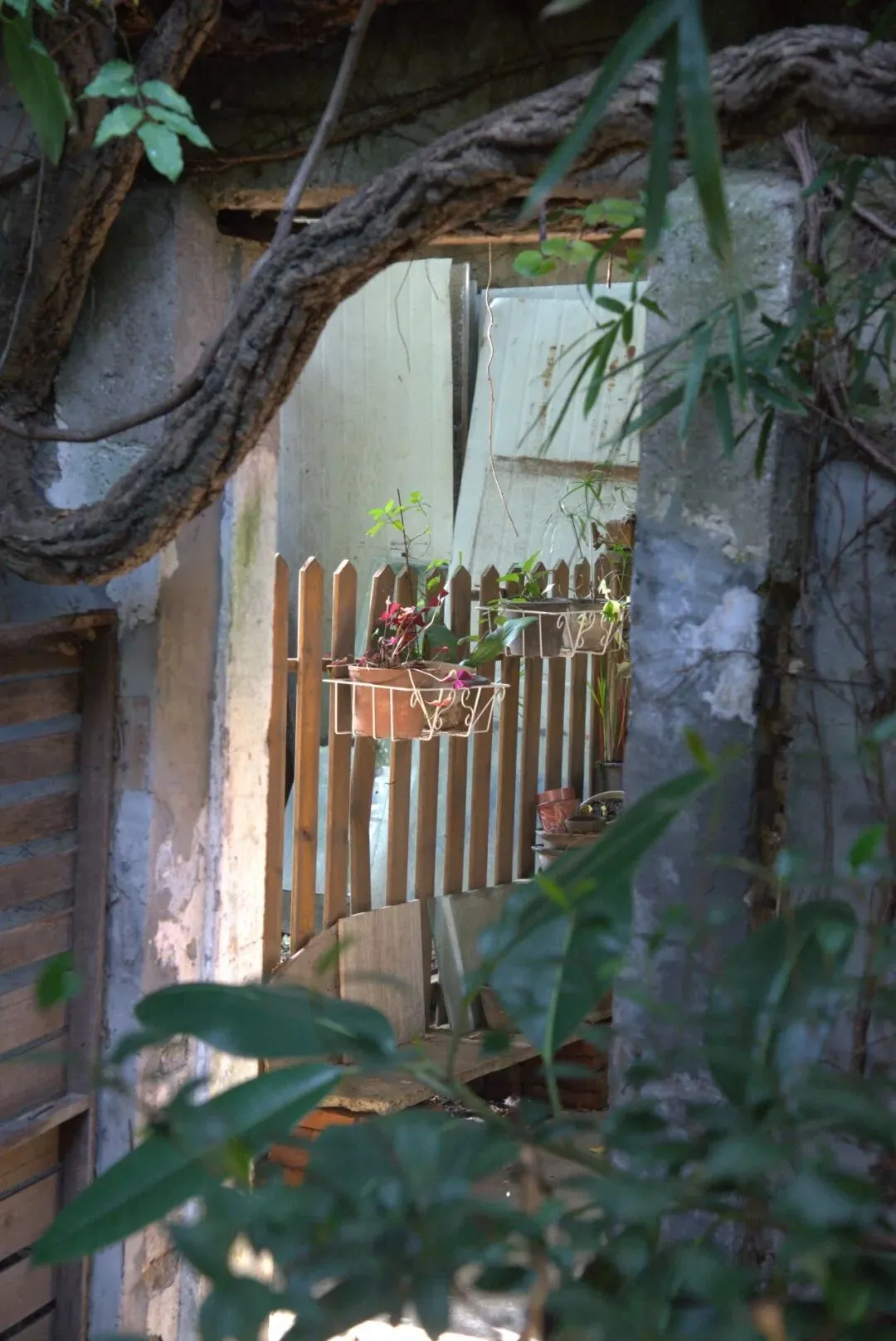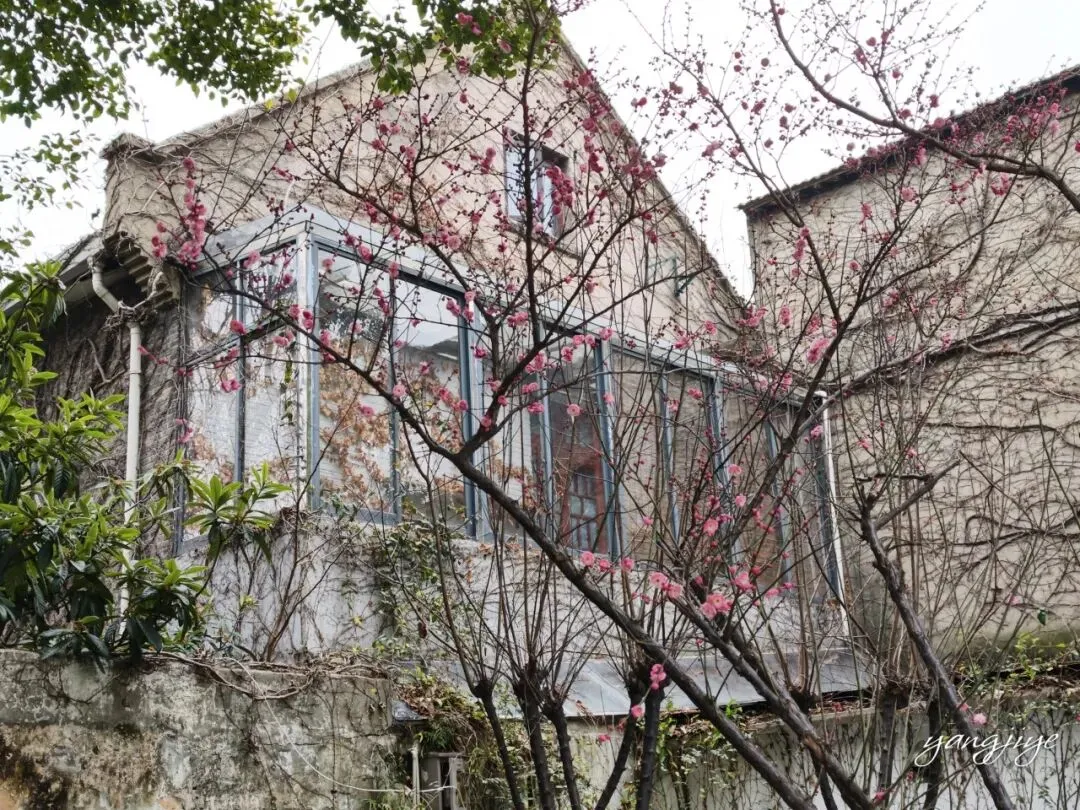 步入院内,更能感受到这份独特的静谧。木质的栅栏门后,几盆花草点缀其间,红的叶、绿的枝,在主人沈老师静心打造的雅致环境里,还藏着80多年树龄的石榴树、梨树等老树。凌霄花顺着斑驳的墙面攀援而上,缀着簇簇红花,为这处老建筑增添了几分鲜活的气息。透过藤蔓的缝隙,隐约可见院内的门窗,木质的框架虽已有些斑驳,却依然透着当年的精致。这里的每一块砖、每一片瓦,都承载着历史的重量。作为1946年营造的花园住宅,它见证了时代的变迁,从战火纷飞的年代,到如今的和平岁月,始终以一种从容的姿态,矗立在高桥的街巷之中。