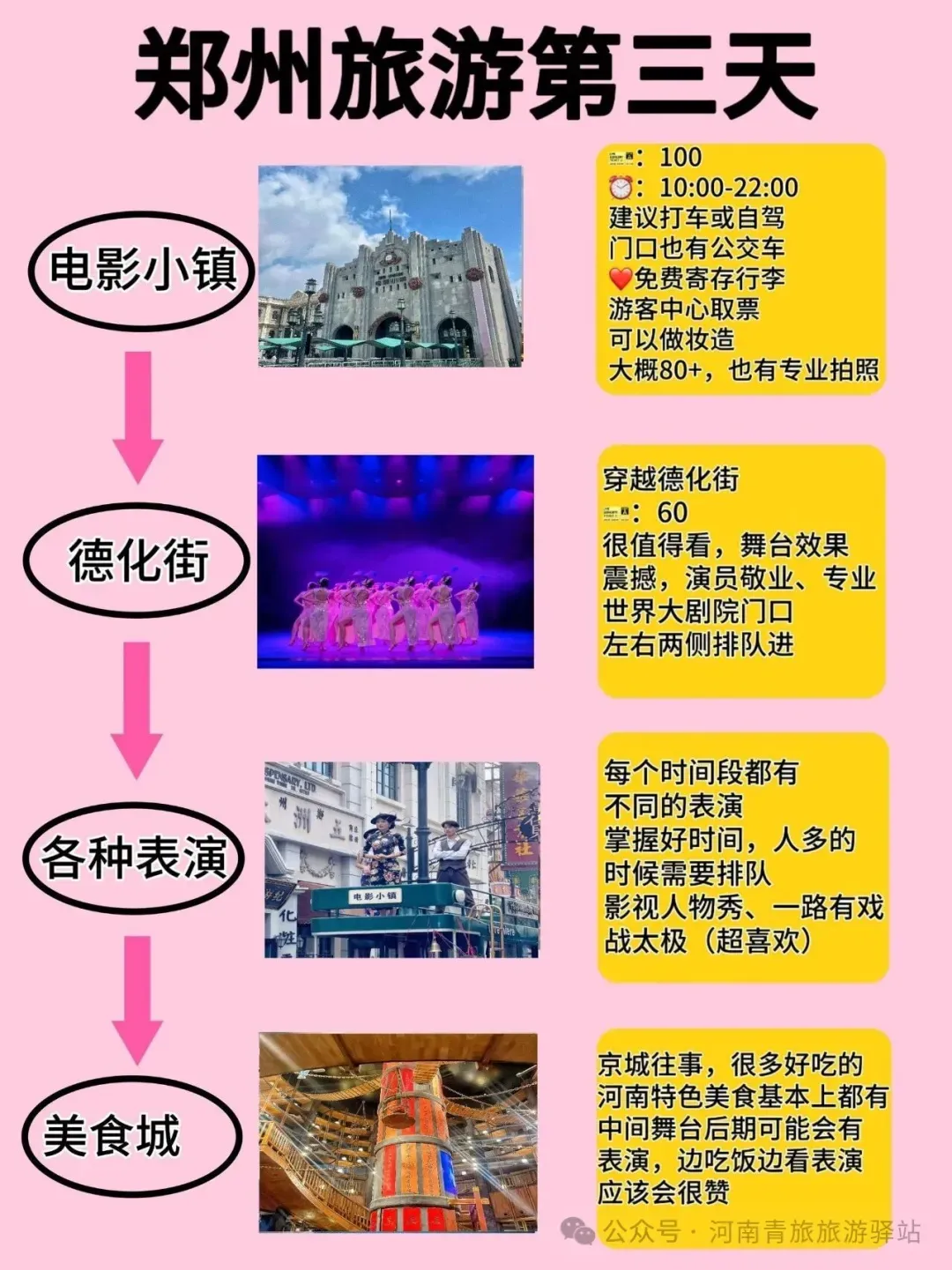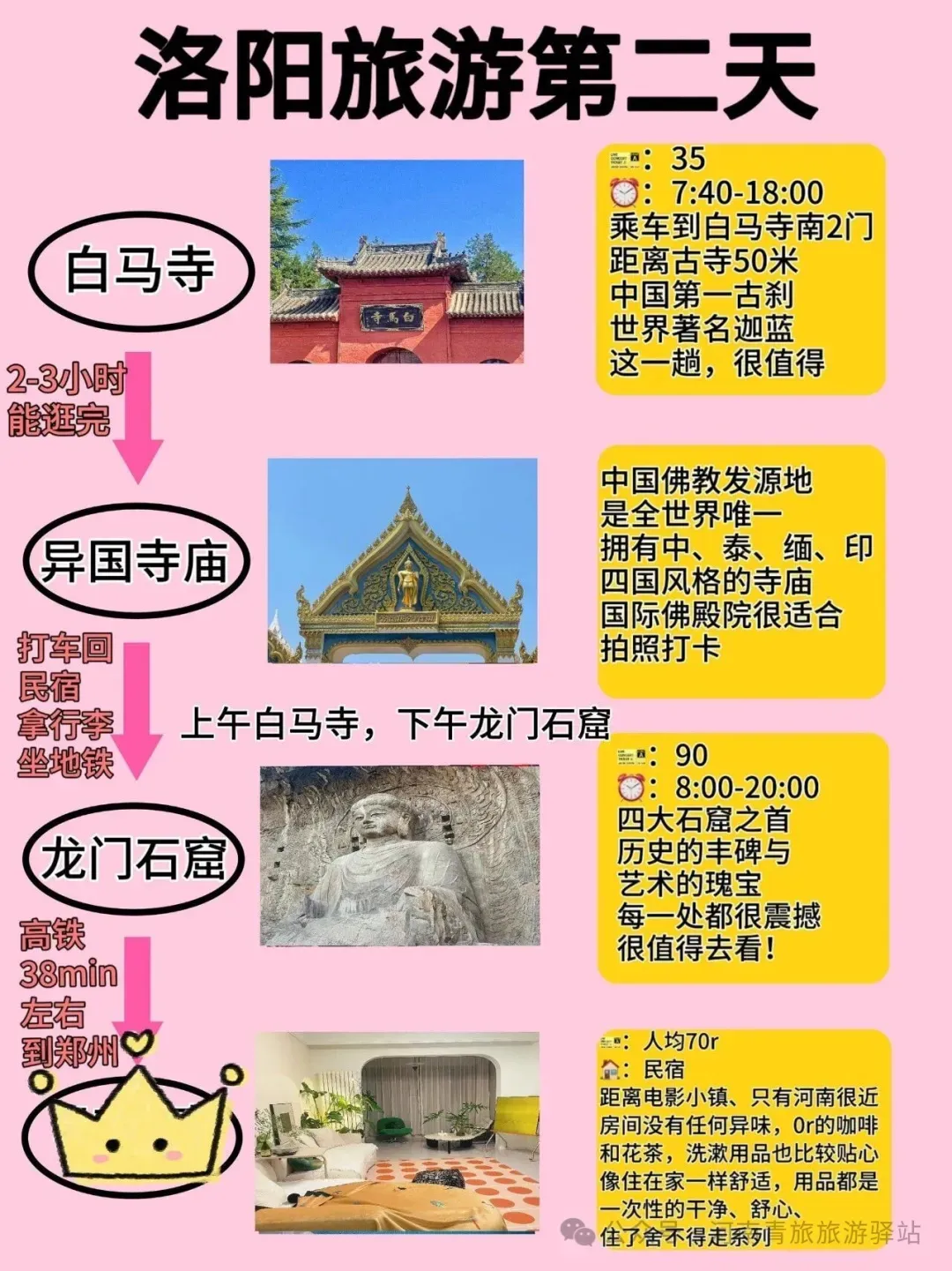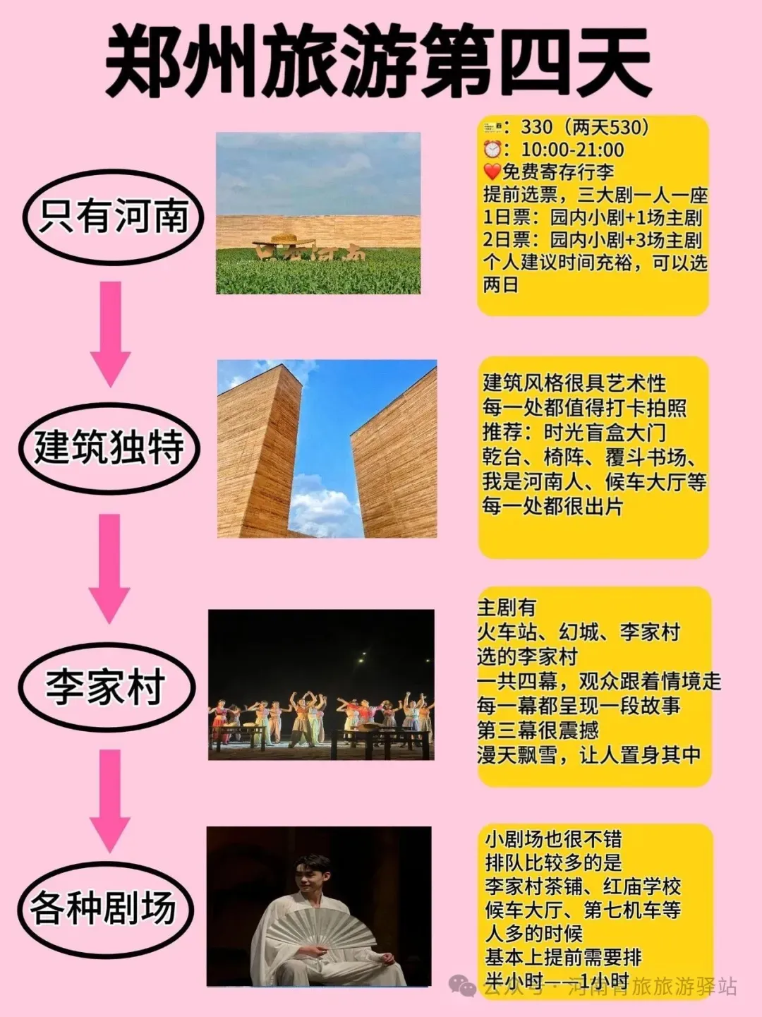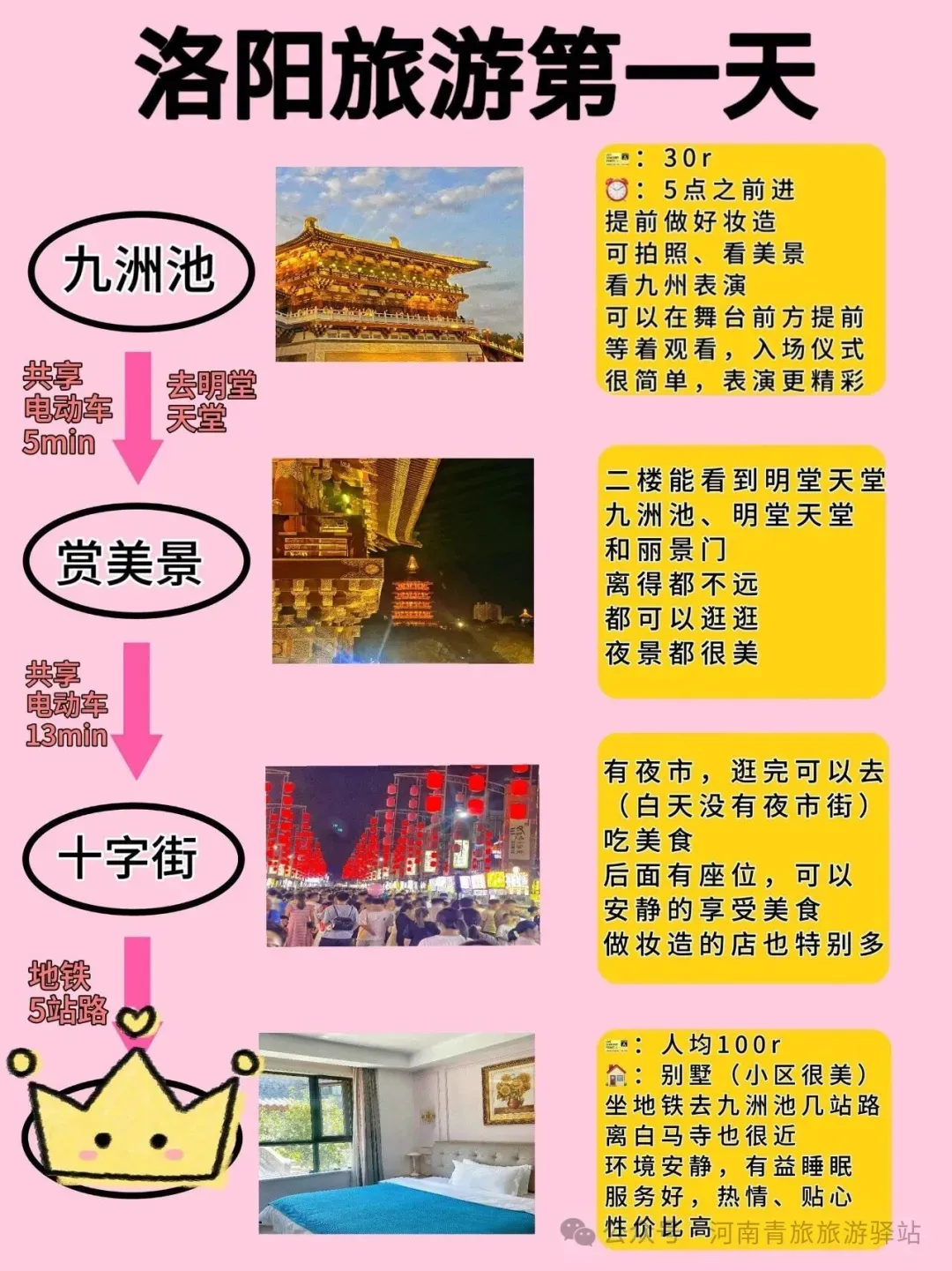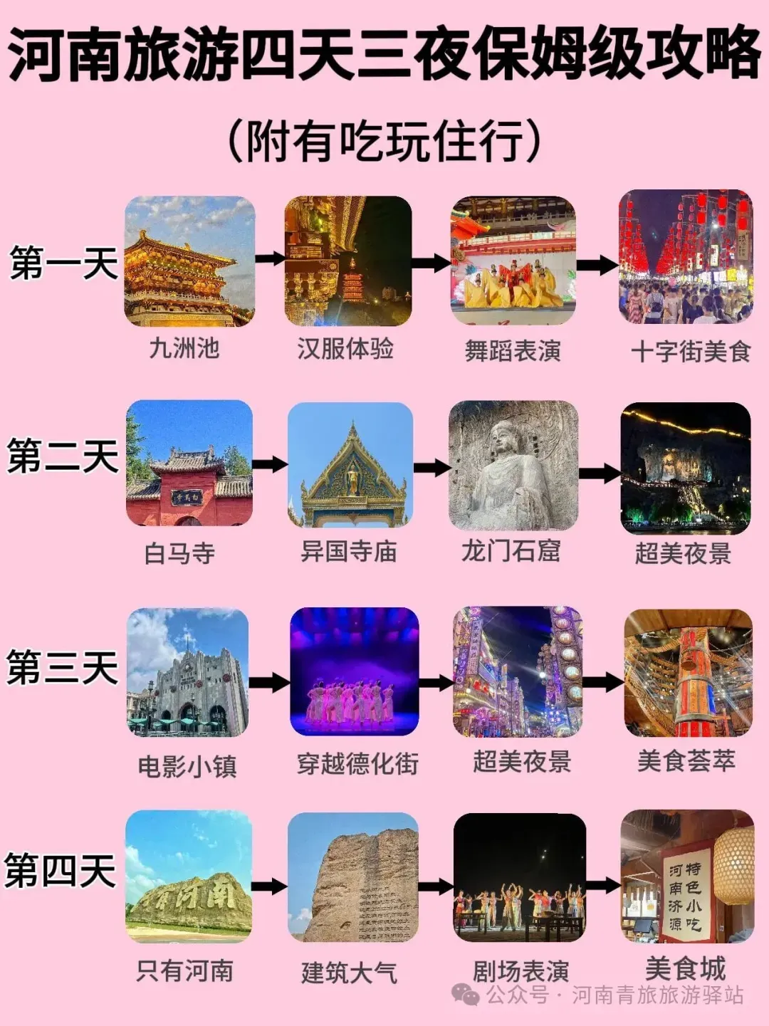 洛阳郑州四天的行程安排: 第1天 九洲池(v提前订,教资半r)✅提前预订民宿接送(无偿)✅住宿地方放行李——十字街——吃午饭✅做妆造—九洲池—拍照看美景、表演—明堂天堂—应天门🏠民宿本来以为是普通民宿,到了才知道是别墅👍第2天:⭐️上午:白马寺🎫:35r(v提前订,教资半r)⏰:07:40-18:00,行李寄存5r✅🚖打车——白马寺南2门(步行2min)✅不愧是中国第一古刹,世界著名迦蓝✅止语茶社可以休息(茶水无偿)✅异国寺庙风格独特,不是山寨⭐️下午:龙门石窟🎫:90r (v提前订,教资半r)⏰:8:00-20:00【龙门高铁站、龙门石窟都可行李寄存】✅🚇八里堂A口出,下来打车(10分钟)✅售票大厅买观光车票(10r),步行也可✅龙门石窟夜景7点30开灯,提前去东区✅❤️看夜景可以四点进园——逛两个小时——六点半过桥去礼佛台,先买观光车🎫‼️(六点半以后人超多!)🔴9点出发去郑州🔴洛阳龙门——郑州东站🔴🚖出租——民宿第3天:⭐️建业电影小镇🎫:100r⏰:10:00-22:00,行李无偿寄存✅提前选票,穿越德化街一人一🎫✅有节目单,每个时间点都有节目✅一路有戏,共四场,看完第二场舞蹈表演去太极湖水码头(提前去有位置坐)看第四场,结束还有烟花秀!✅晚上灯光亮的时候,有上海滩的即视感第4天:⭐️只有河南·戏剧幻城🎫:330r,两天530r⏰:10:00-21:00,行李无偿寄存✅时间充足的话,建议两天✅提前选票,主剧:火车站、李家村、幻城✅推荐小剧:李家村茶铺(黑七很帅)、第七机车、老院子、红庙学校✅出片:时光盲盒大门、乾台、椅阵、红庙学校、覆斗书场、我是河南人