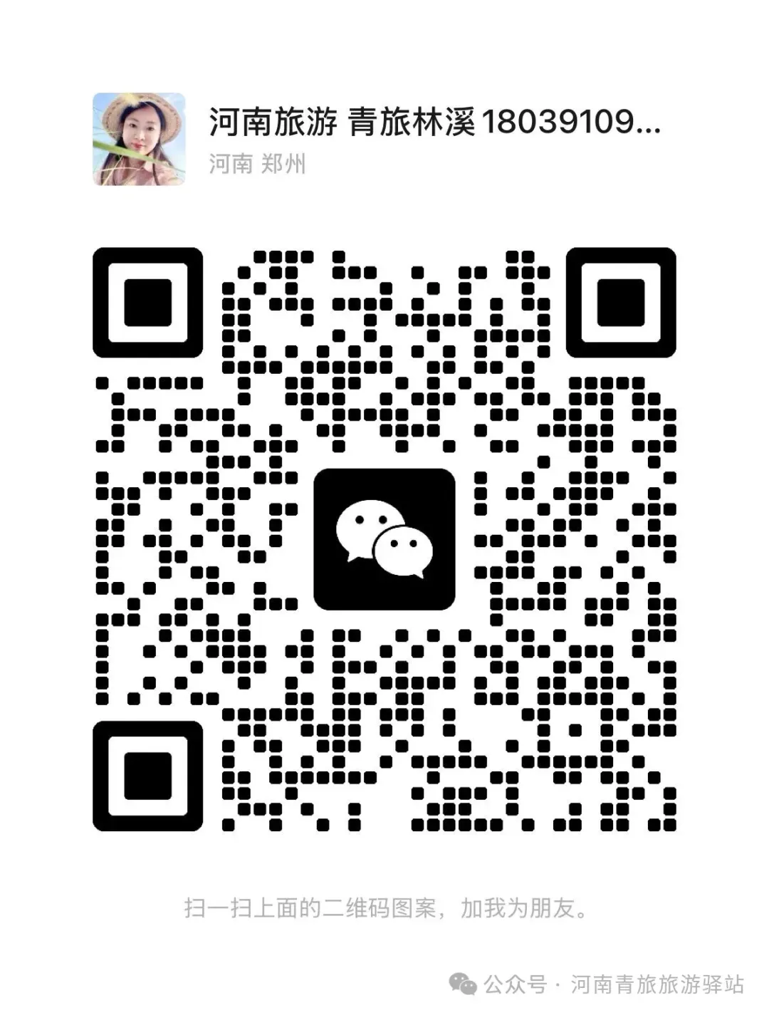 我是河南青旅林溪,电话:18039109902,专注河南旅游18年,擅长:团队旅游,散客出行,拓展培训,自由行,红培,签证,国内外机票,订车,酒店订房,大家有旅游方面的问题可以加一下我的微信,随时问我这边,我一定会用自己最专业的知识为您解答。旅游是一场心灵的修行,我要做的就是为大家提供最详实准确的讲解,以及给您推荐更合适的旅游线路,人本旅游,悉心服务,真诚用心,让客户放心是我的承诺。