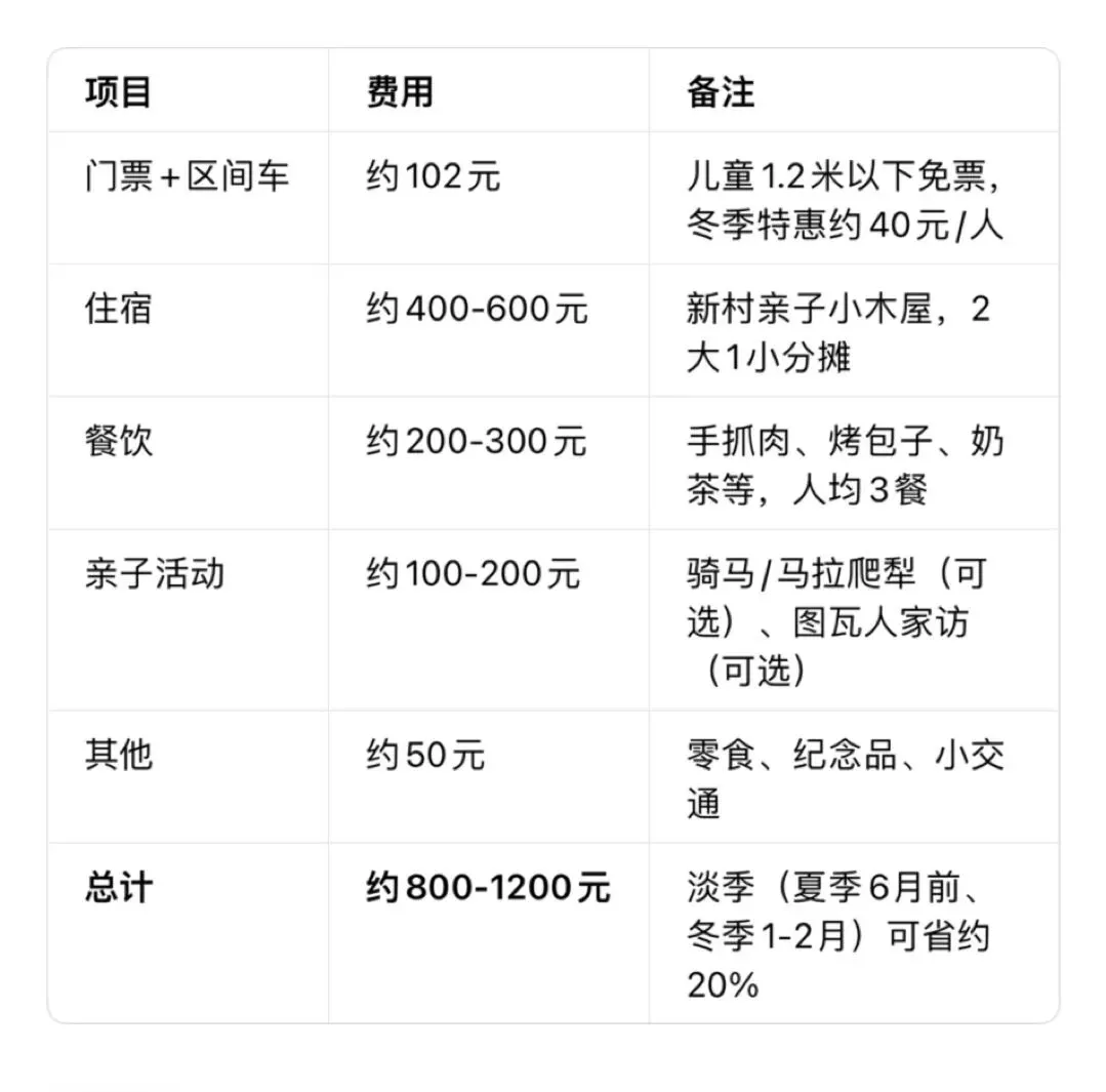 总计 约800-1200元 淡季(夏季6月前、冬季1-2月)可省约20%