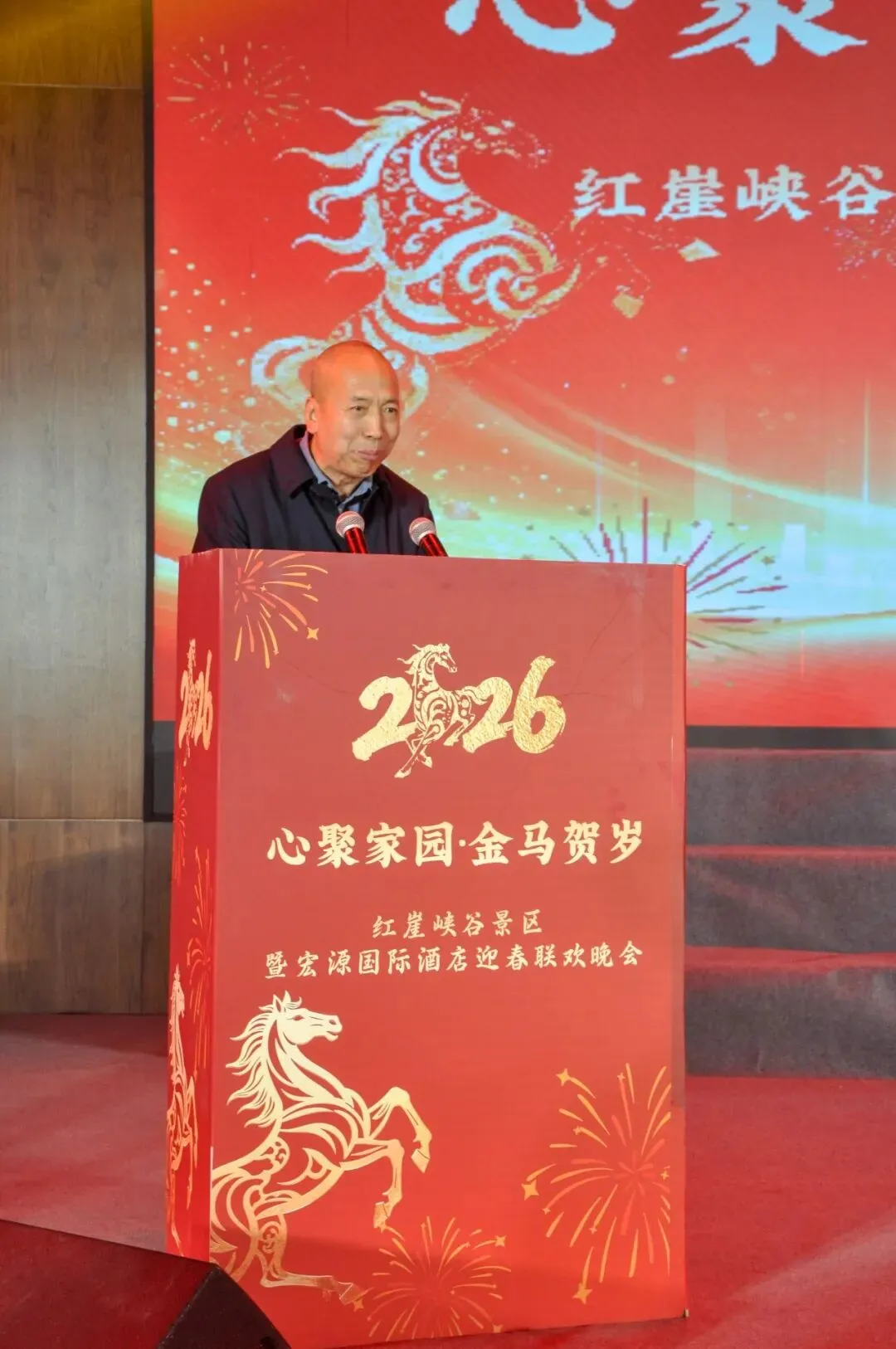 晚会在灵石老年大学静升分校选送的开场舞《欢聚一堂》中拉开帷幕。喜庆的舞步瞬间点燃了全场的热烈氛围。随后,红崖峡谷景区与宏源国际酒店董事长张建共发表新春致辞。他全面总结了过去一年里,景区与酒店在创新发展道路上取得的卓越成就,向全体员工的辛勤付出与不懈努力致以诚挚感谢,并向所有来宾致以新春祝福。张建共董事长表示,新的一年将继续深化创新驱动,力争在2026年实现新的跨越与突破。