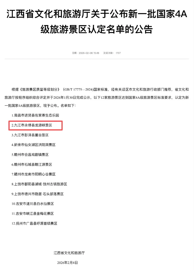 2月6日,江西省文化和旅游厅发布新一批国家4A级旅游景区认定名单的公告,九江市永修县龙源峡景区,被认定为国家4A级旅游景区。
