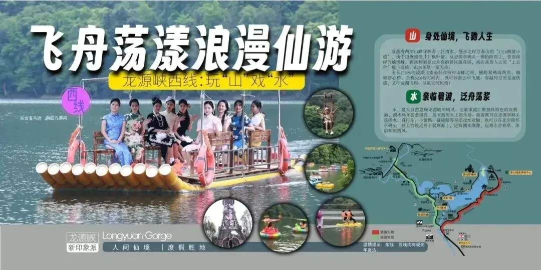 依据旅游功能和区块位置的不同,景区游玩项目分为“摩托森林穿越”、“相约山盟海誓”“欢愉游山戏水”、“住仙居享仙厨”等四个主题版块。同时,醉美龙源仙境体验适宜不同季节,春赏桐花烟雨、夏纳湖面凉风、秋观层林尽染、冬览玉树银花。为满足不同游玩需求,景区推出东西两条闭环游线。