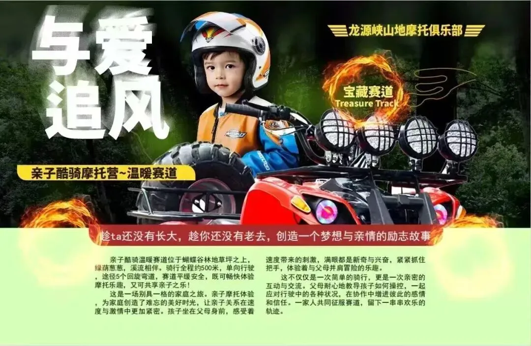 亲子酷骑温暖赛道位于蝴蝶谷林地草坪之上,绿荫葱葱,溪流相伴。骑行全程约500米,单向行驶,途径多个回旋弯道,赛道平缓安全,既可畅快体验摩托乐趣,又可共享亲子之乐,温馨相伴、勇气锻炼,陪TA勇敢前行!