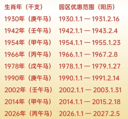 2、生肖属马游客:持身份证、护照等有效证件,可免费入园(对应出生年份范围见下表)