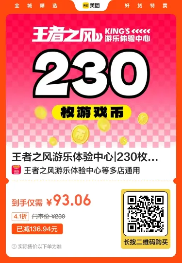 🎁【王者之风游乐体验中心230枚游戏币套餐】多店通用