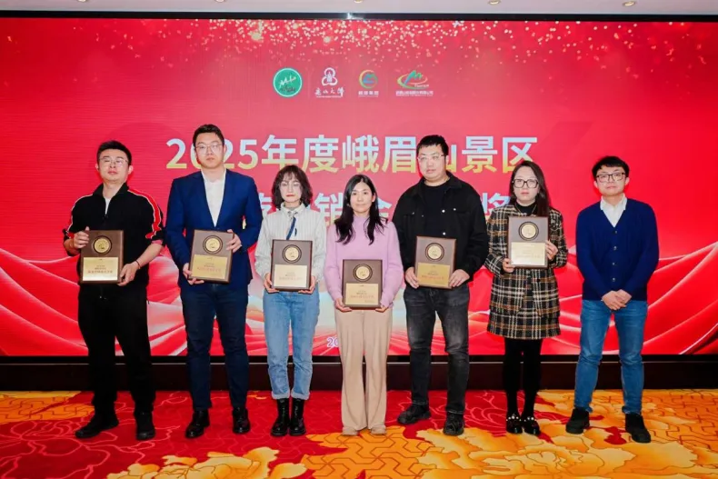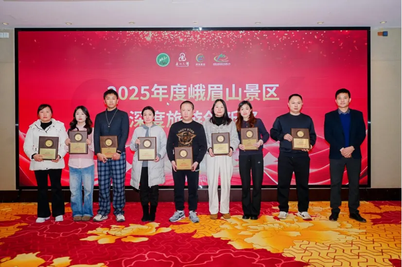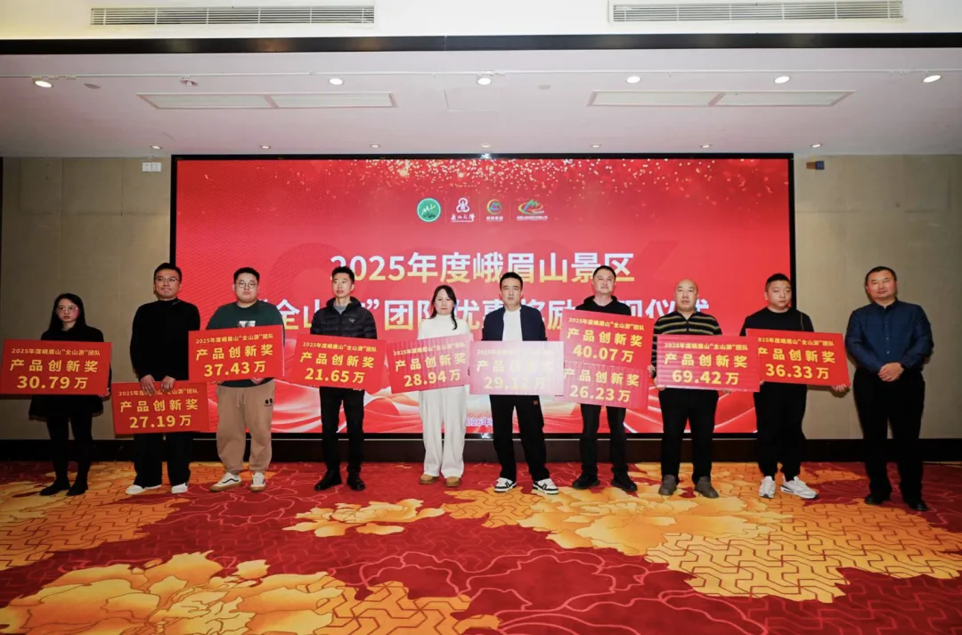 在峨眉山景区奖项颁发环节,先后颁发了“四季旅游贡献奖”“深度旅游创新奖”“入境旅游拓展奖”“旅游营销金点子奖”四大奖项。各获奖单位代表依次上台领奖,相关领导为获奖者颁奖并合影留念,感谢他们在旅游市场拓展、产品创新、营销策划等方面为峨眉山景区做出的重要贡献。随后,还举行了 2025 年度峨眉山景区“全山游”团队优惠奖励兑现仪式,相关旅行社代表上台领取奖励,切实让合作伙伴感受到景区的诚意与关怀。