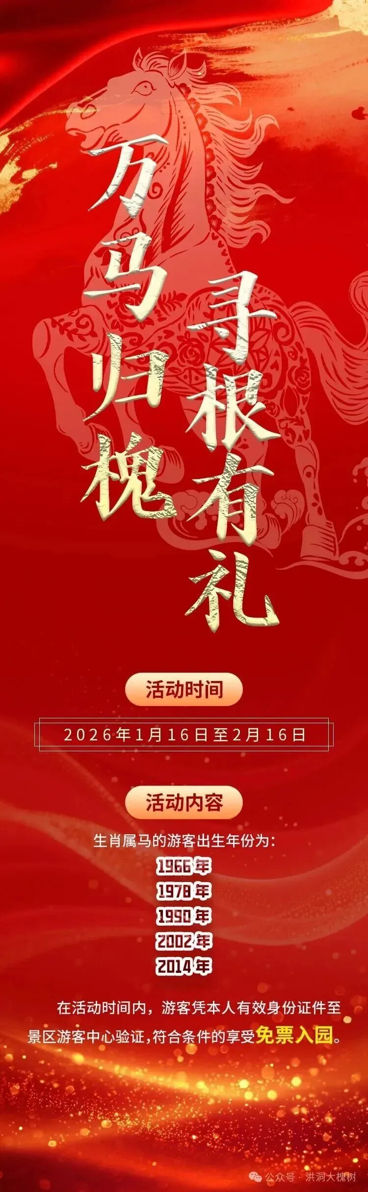 福利内容:凡生肖属马(以身份证出生日期为准,对应农历马年出生),或名字中含“马”字及同音、近音汉字的游客,凭本人有效身份证原件核验后,免景区大门票(不含景交车票)。