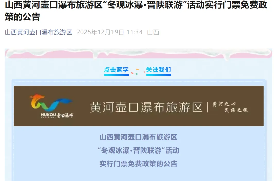 为了回馈全国游客支持和厚爱,山西黄河壶口瀑布旅游区推出“冬观冰瀑•晋陕联游”冬季门票免费活动。景区于2025年12月20日至2026年2月10日面向全国游客实行免门票优惠政策,游客可通过"山西黄河壶口瀑布旅游区"微信服务号或美团、携程、同程等平台进行门票预约。