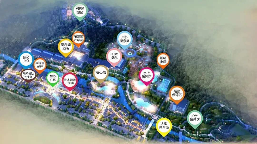 目前已开放阳明温泉、梦幻水乐园、真味堂餐厅、圣泉阁酒店、何陋轩民宿、瑞云山居别墅群、