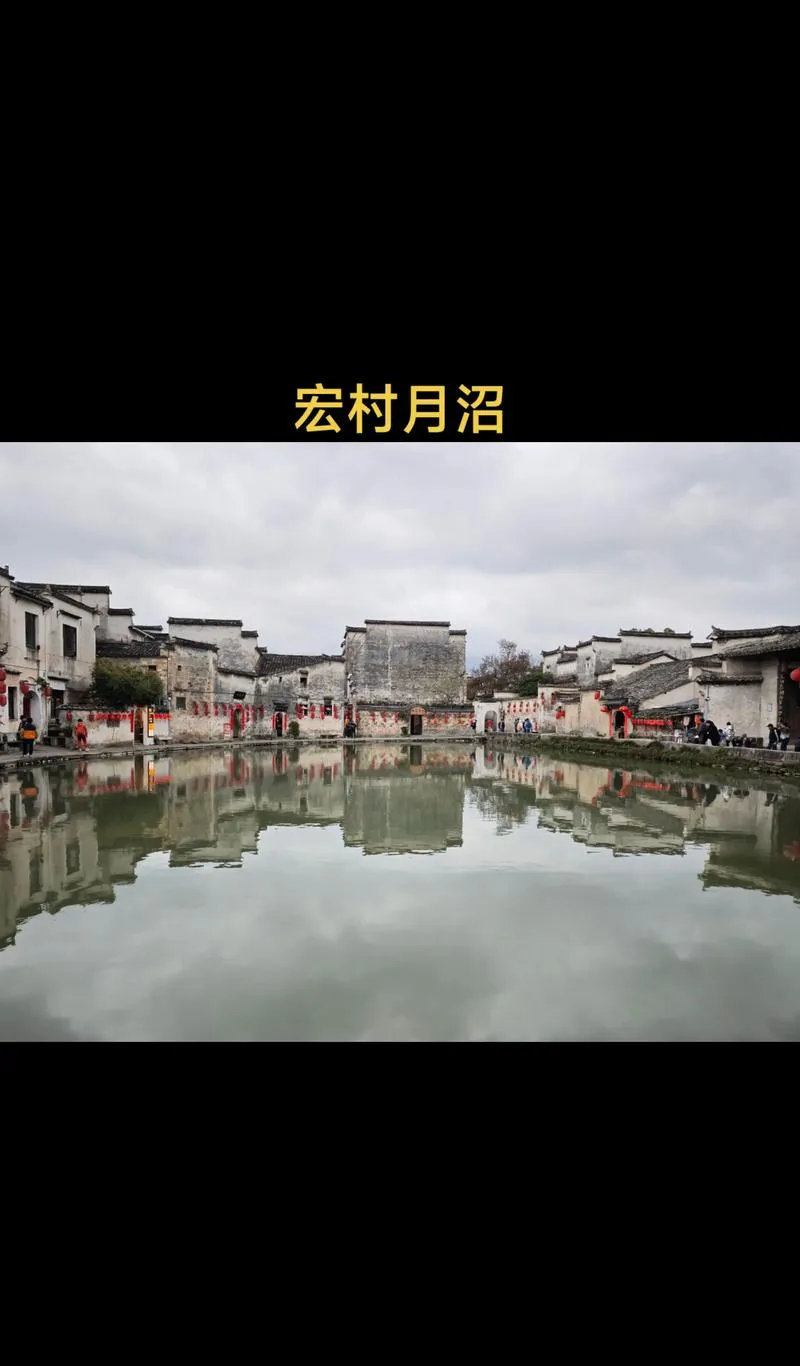 宏村的月沼,清晨有雾。白墙倒映在水里,和天空连成一片灰白。