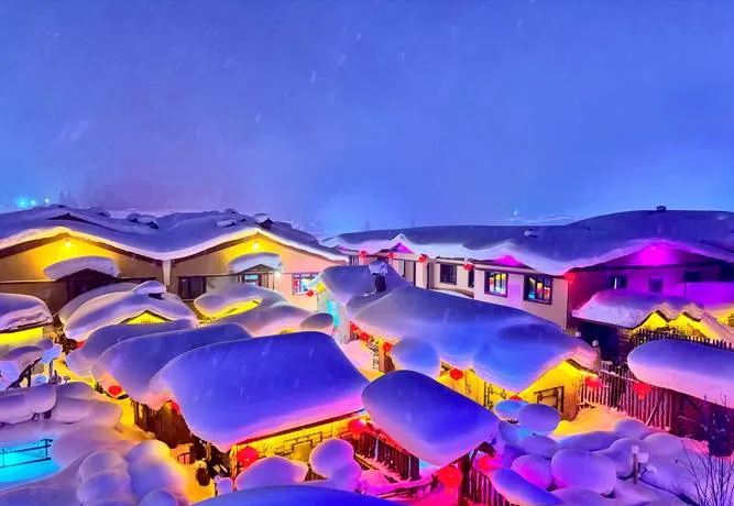 雪乡的雪真的厚。房檐上堆着半米深的积雪,压成圆圆的蘑菇状。